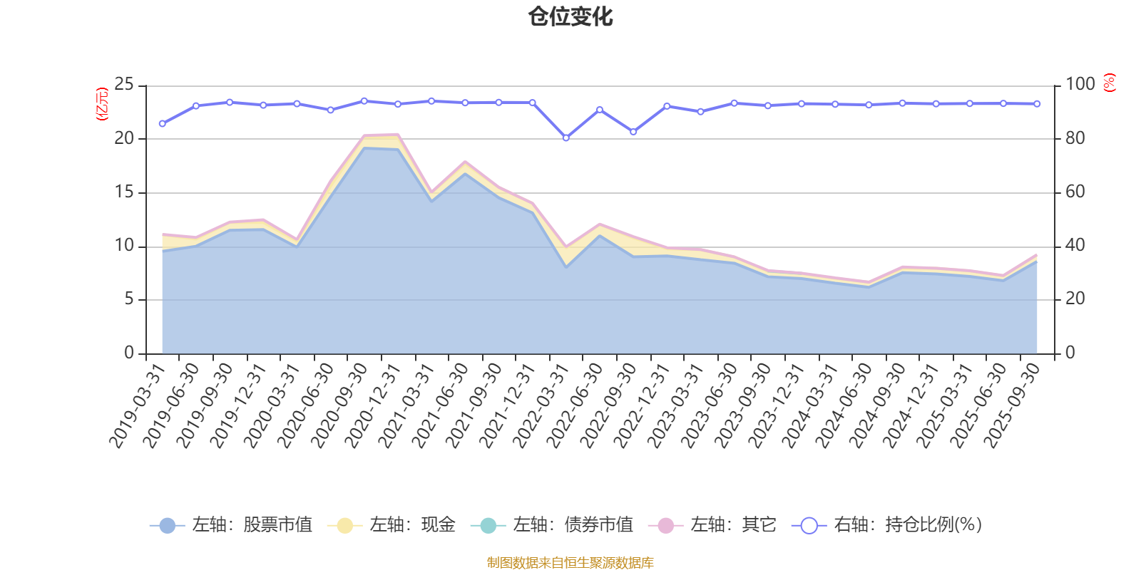据定期报告数据统计,近三年平均股票仓位为92.83%,同类平均为85.84%。2020年三季度末基金达到94.23%的最高仓位,2022年一季度末最低,为80.49%。