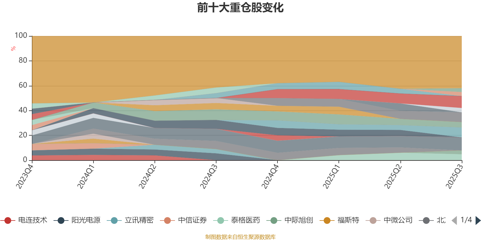 截至2025年三季度末,基金十大重仓股分别是宁德时代、中芯国际、寒武纪、海光信息、泰格医药、德业股份、源杰科技、鼎捷数智、中际旭创、兆易创新。