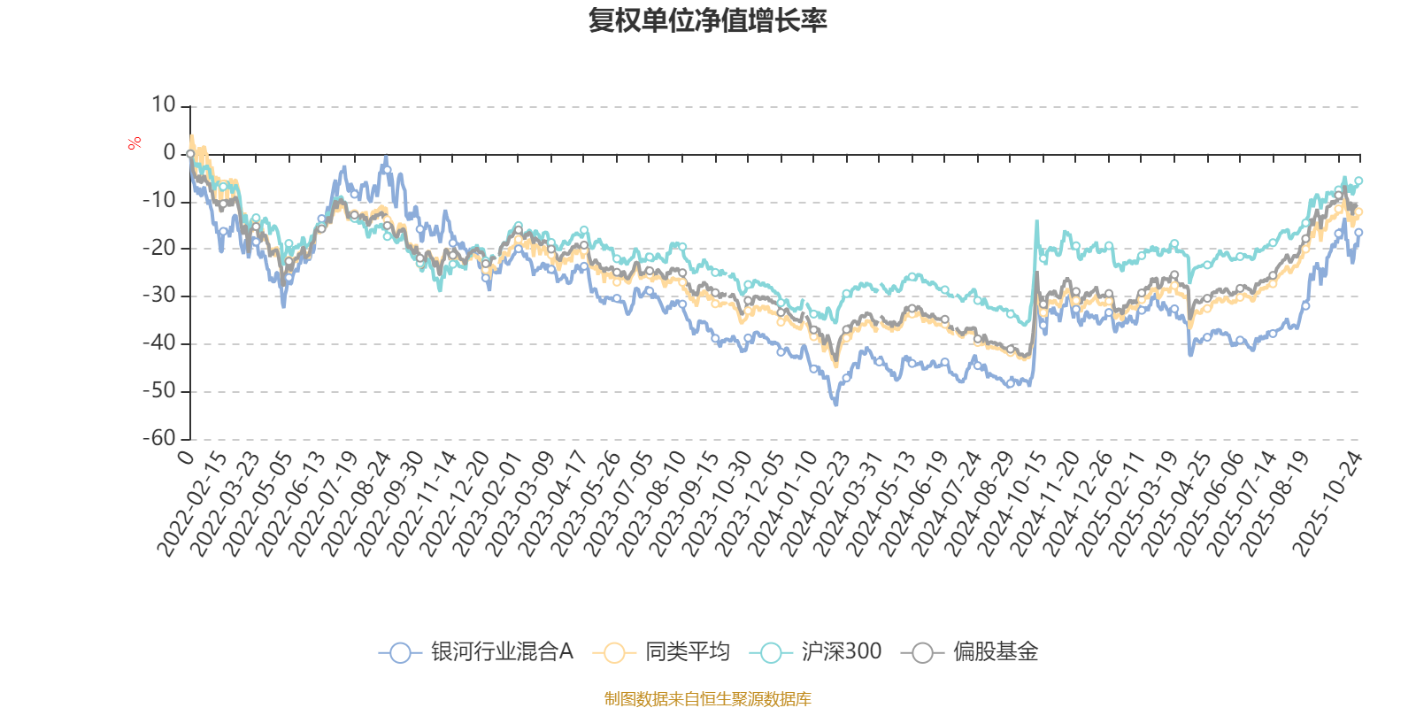 截至10月24日,银河行业混合A近三个月复权单位净值增长率为30.31%,位于同类可比基金37/265;近半年复权单位净值增长率为35.99%,位于同类可比基金75/265;近一年复权单位净值增长率为25.95%,位于同类可比基金145/265;近三年复权单位净值增长率为0.83%,位于同类可比基金197/253。