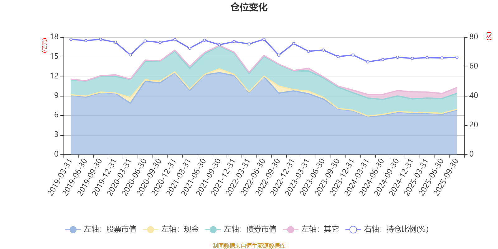 据定期报告数据统计,近三年平均股票仓位为67.59%,同类平均为67.21%。2022年上半年末基金达到78.69%的最高仓位,2024年一季度末最低,为63.26%。