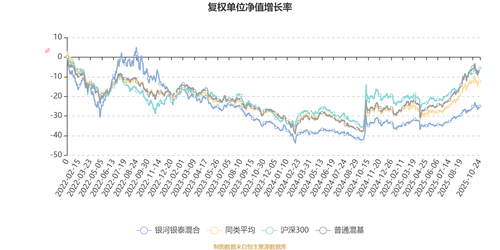 截至10月24日,银河银泰混合近三个月复权单位净值增长率为8.76%,位于同类可比基金75/134;近半年复权单位净值增长率为15.21%,位于同类可比基金81/134;近一年复权单位净值增长率为13.51%,位于同类可比基金88/130;近三年复权单位净值增长率为-15.32%,位于同类可比基金114/119。