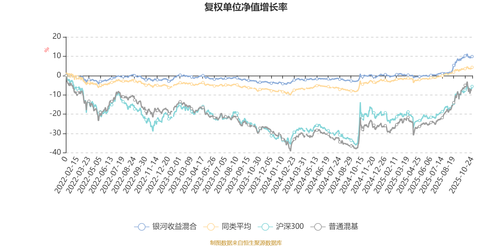 截至10月24日,银河收益混合近三个月复权单位净值增长率为8.53%,位于同类可比基金31/629;近半年复权单位净值增长率为10.49%,位于同类可比基金71/629;近一年复权单位净值增长率为10.09%,位于同类可比基金147/623;近三年复权单位净值增长率为12.47%,位于同类可比基金231/556。