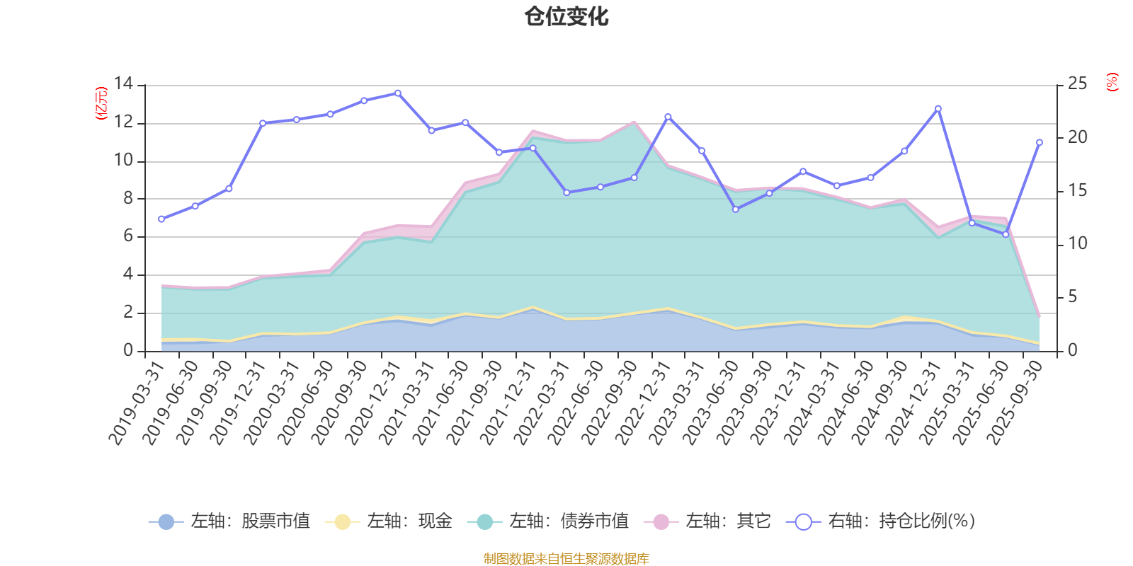 据定期报告数据统计,近三年平均股票仓位为16.82%,同类平均为19.03%。2020年末基金达到24.23%的最高仓位,2025年上半年末最低,为10.97%。