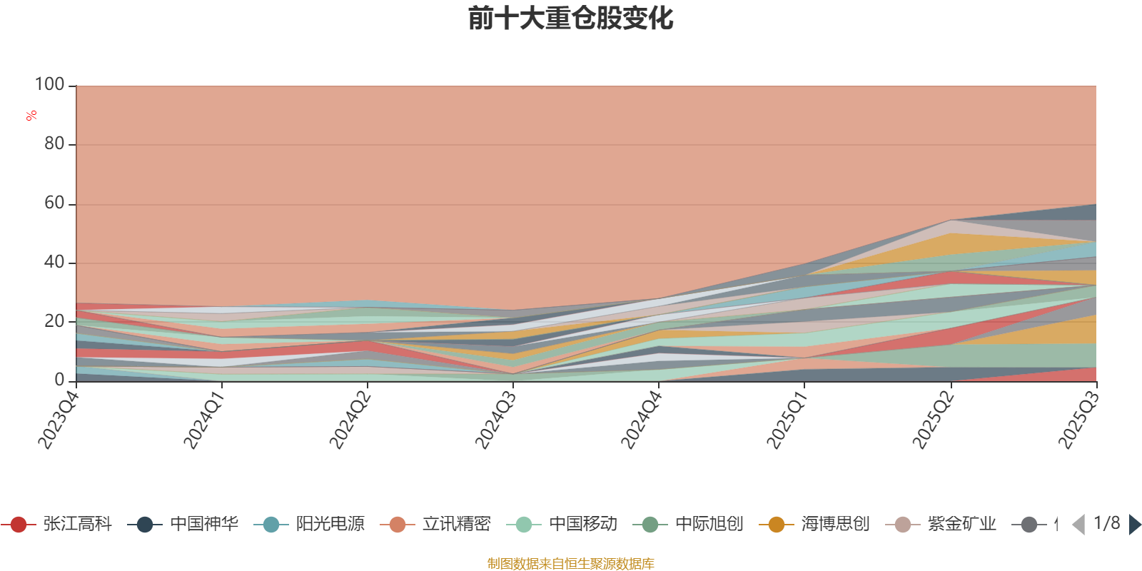 基金管理人在三季报中表示,权益部分,本基金对权益市场保持谨慎乐观态度,在三季度保持了中性偏高的权益仓位。持仓配置向科技成长切换,看好半导体、AI 产业链和机器人相关标的。