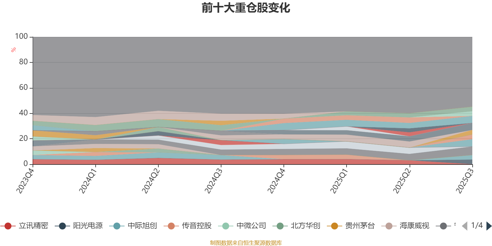 截至2025年三季度末,基金十大重仓股分别是宁德时代、寒武纪、中芯国际、海光信息、澜起科技、同花顺、中际旭创、阳光电源、亿纬锂能、工业富联。