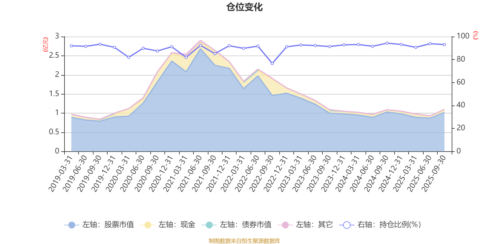 据定期报告数据统计,近三年平均股票仓位为92.49%,同类平均为72.18%。2024年三季度末基金达到94.32%的最高仓位,2022年三季度末最低,为76.59%。