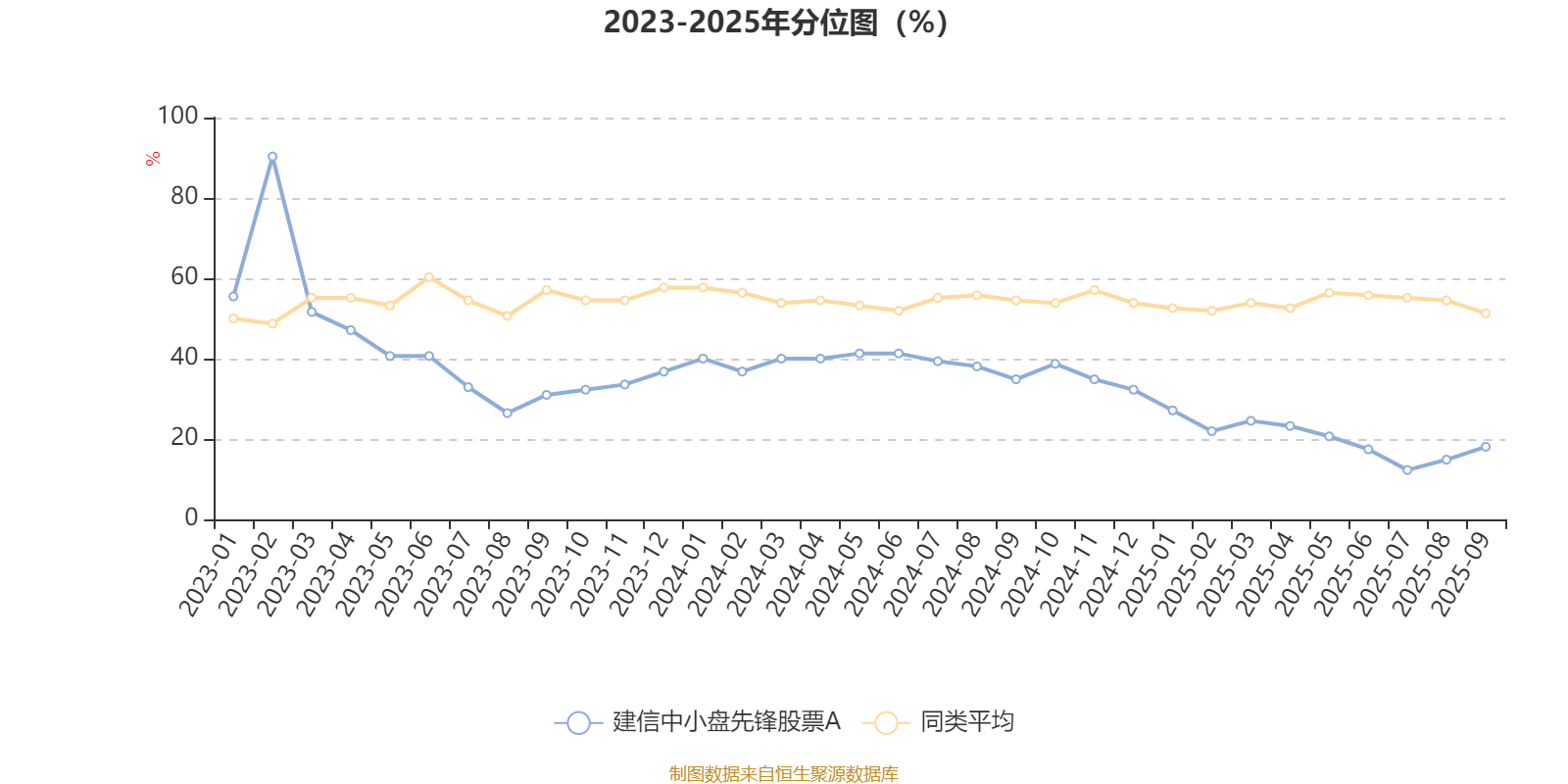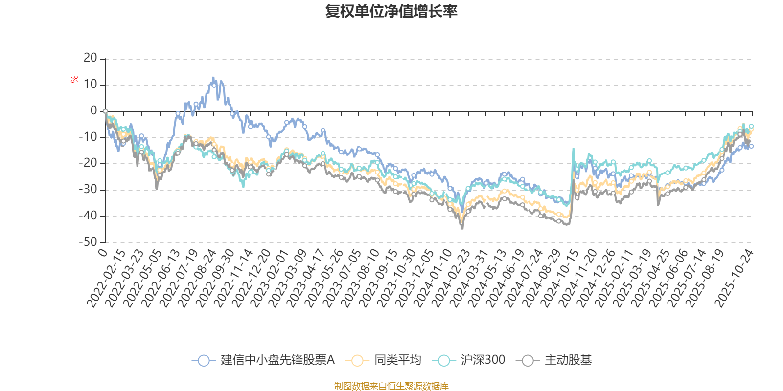 截至10月24日,建信中小盘先锋股票A近三个月复权单位净值增长率为15.55%,位于同类可比基金82/167;近半年复权单位净值增长率为21.12%,位于同类可比基金123/166;近一年复权单位净值增长率为10.93%,位于同类可比基金146/164;近三年复权单位净值增长率为-10.26%,位于同类可比基金142/156。