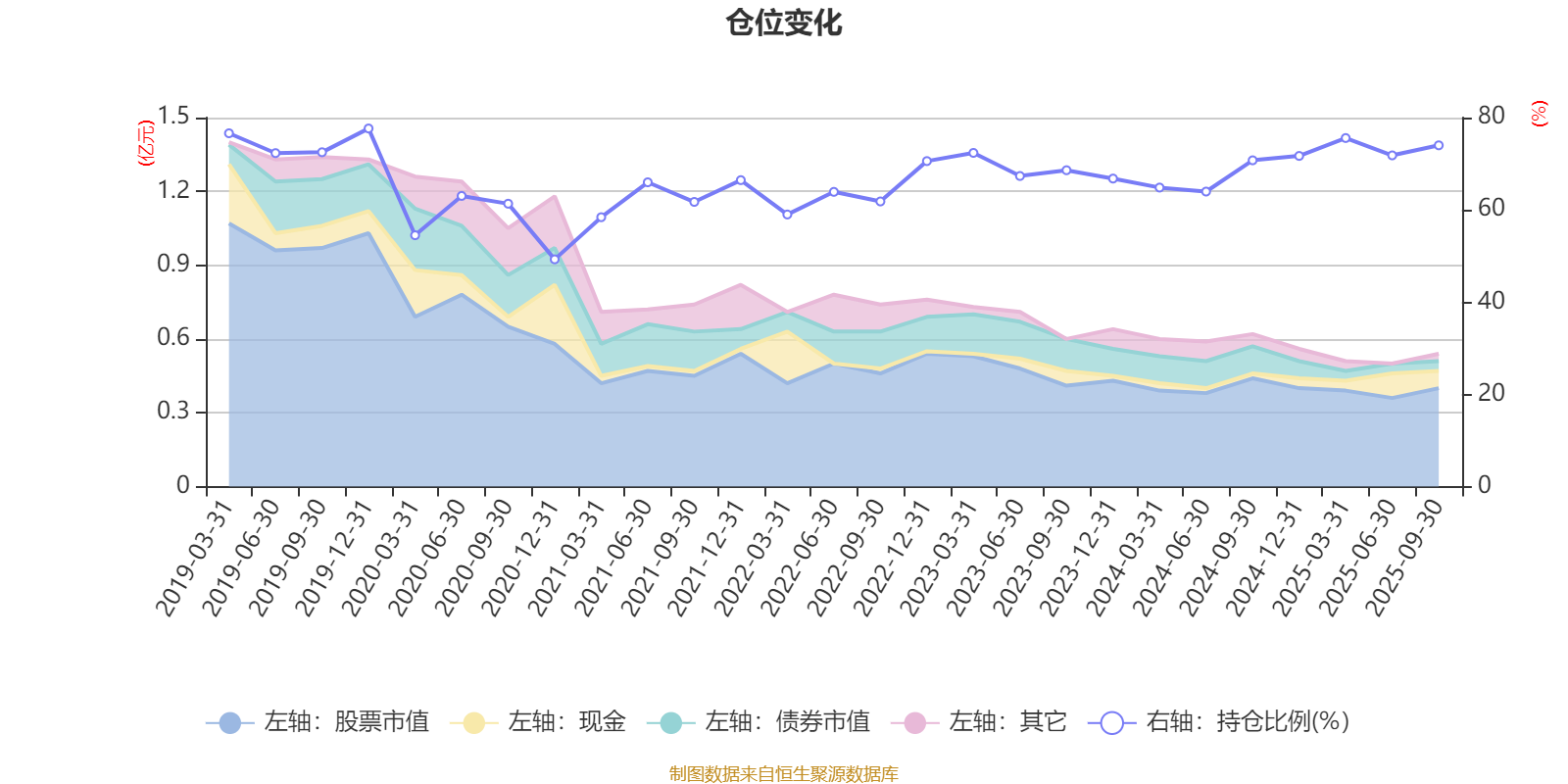 据定期报告数据统计,近三年平均股票仓位为69.85%,同类平均为72.18%。2019年末基金达到77.64%的最高仓位,2020年末最低,为49.27%。