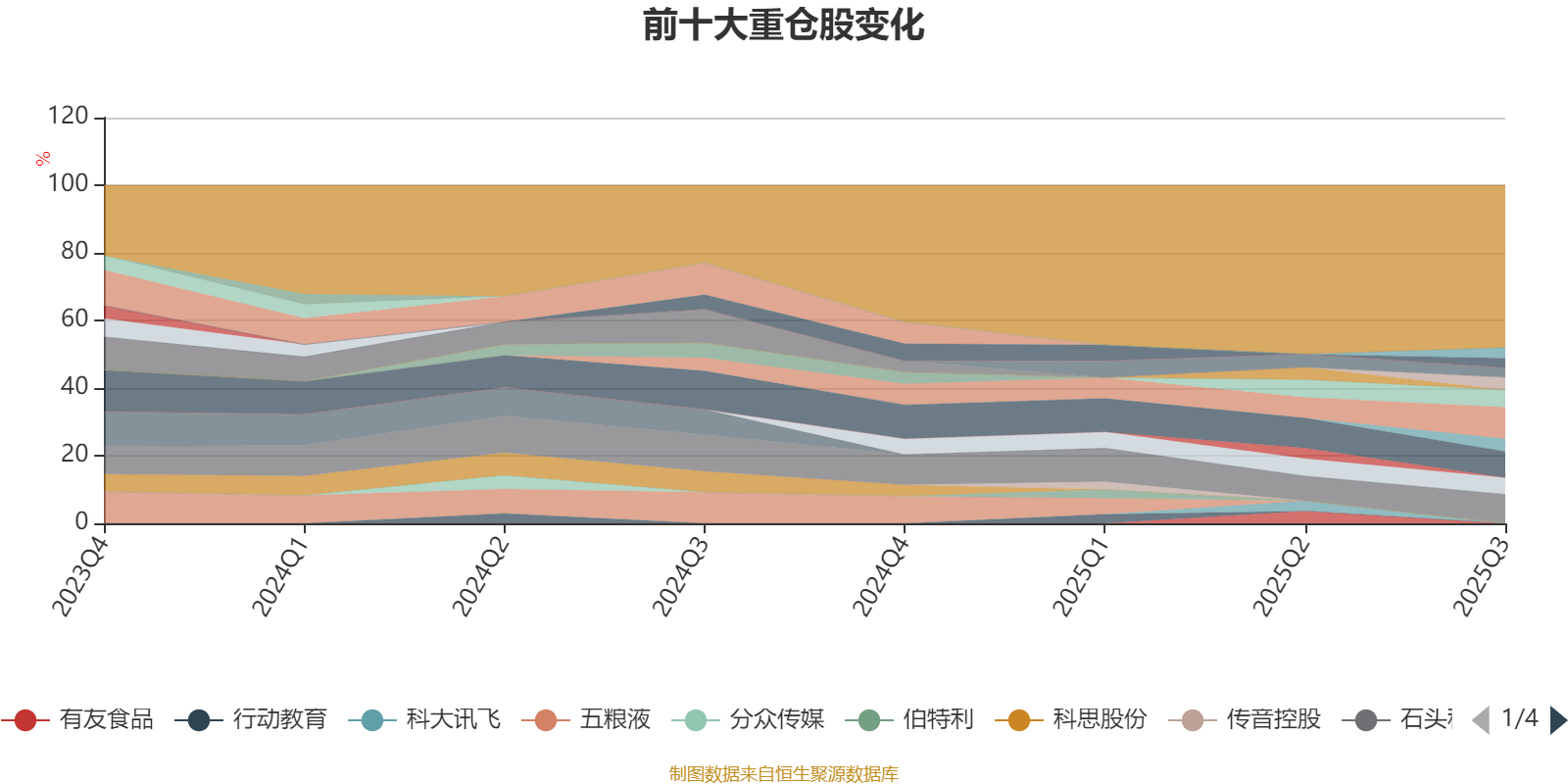 该基金持股集中度较高。截至2025年三季度末,基金十大重仓股分别是宁德时代、石头科技、贵州茅台、小商品城、美的集团、ST华通、药明康德、若羽臣、新澳股份、比亚迪。