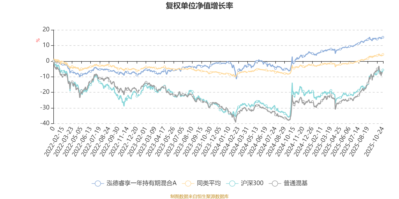 截至10月24日,泓德睿享一年持有期混合A近三个月复权单位净值增长率为2.29%,位于同类可比基金311/629;近半年复权单位净值增长率为7.16%,位于同类可比基金181/629;近一年复权单位净值增长率为14.18%,位于同类可比基金58/623;近三年复权单位净值增长率为25.70%,位于同类可比基金34/556。