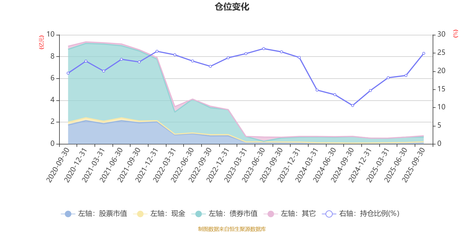 据定期报告数据统计,近三年平均股票仓位为19.95%,同类平均为19.03%。2023年上半年末基金达到26.2%的最高仓位,2024年三季度末最低,为10.58%。