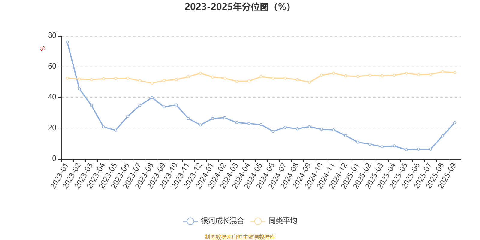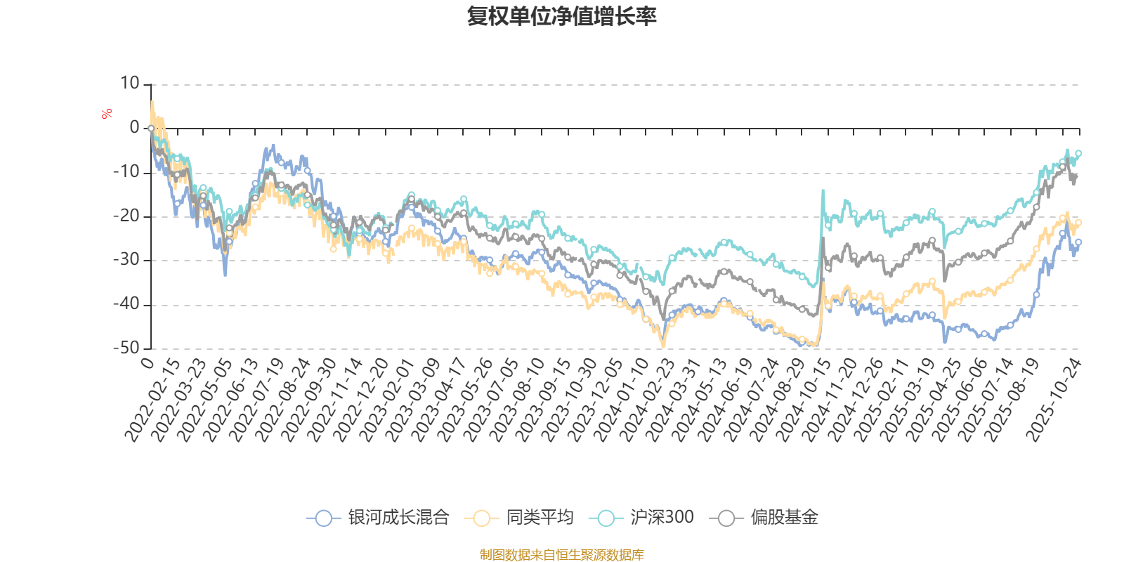 截至10月24日,银河成长混合近三个月复权单位净值增长率为29.13%,位于同类可比基金77/621;近半年复权单位净值增长率为35.41%,位于同类可比基金187/618;近一年复权单位净值增长率为22.61%,位于同类可比基金382/611;近三年复权单位净值增长率为-3.25%,位于同类可比基金422/518。