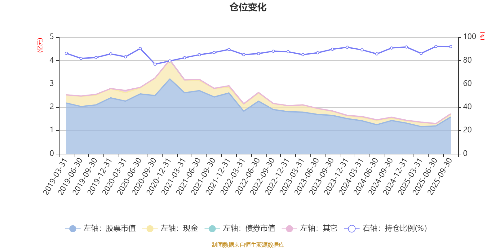 据定期报告数据统计,近三年平均股票仓位为88.97%,同类平均为85.47%。2025年上半年末基金达到92.07%的最高仓位,2020年三季度末最低,为76.91%。