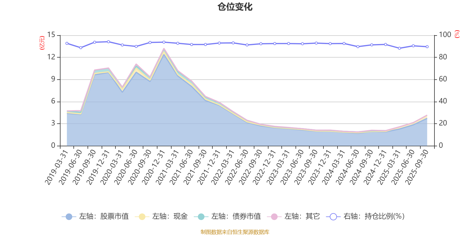 据定期报告数据统计,近三年平均股票仓位为91.35%,同类平均为85.47%。2019年末基金达到94.14%的最高仓位,2025年一季度末最低,为88.27%。