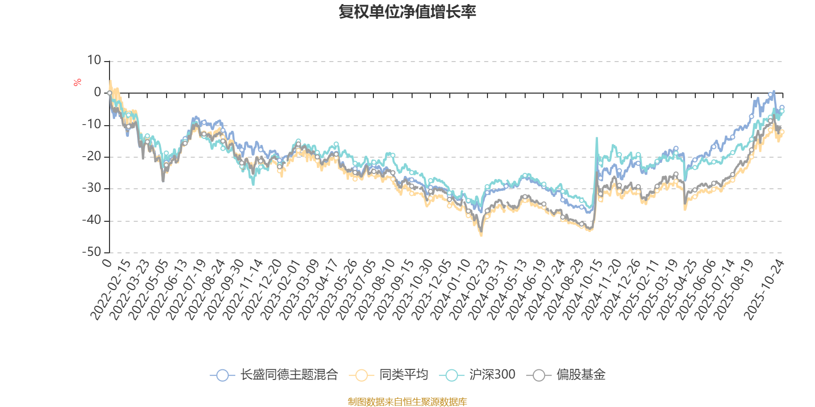 截至10月24日,长盛同德主题混合近三个月复权单位净值增长率为8.27%,位于同类可比基金202/265;近半年复权单位净值增长率为21.06%,位于同类可比基金185/265;近一年复权单位净值增长率为26.36%,位于同类可比基金142/265;近三年复权单位净值增长率为15.24%,位于同类可比基金137/253。