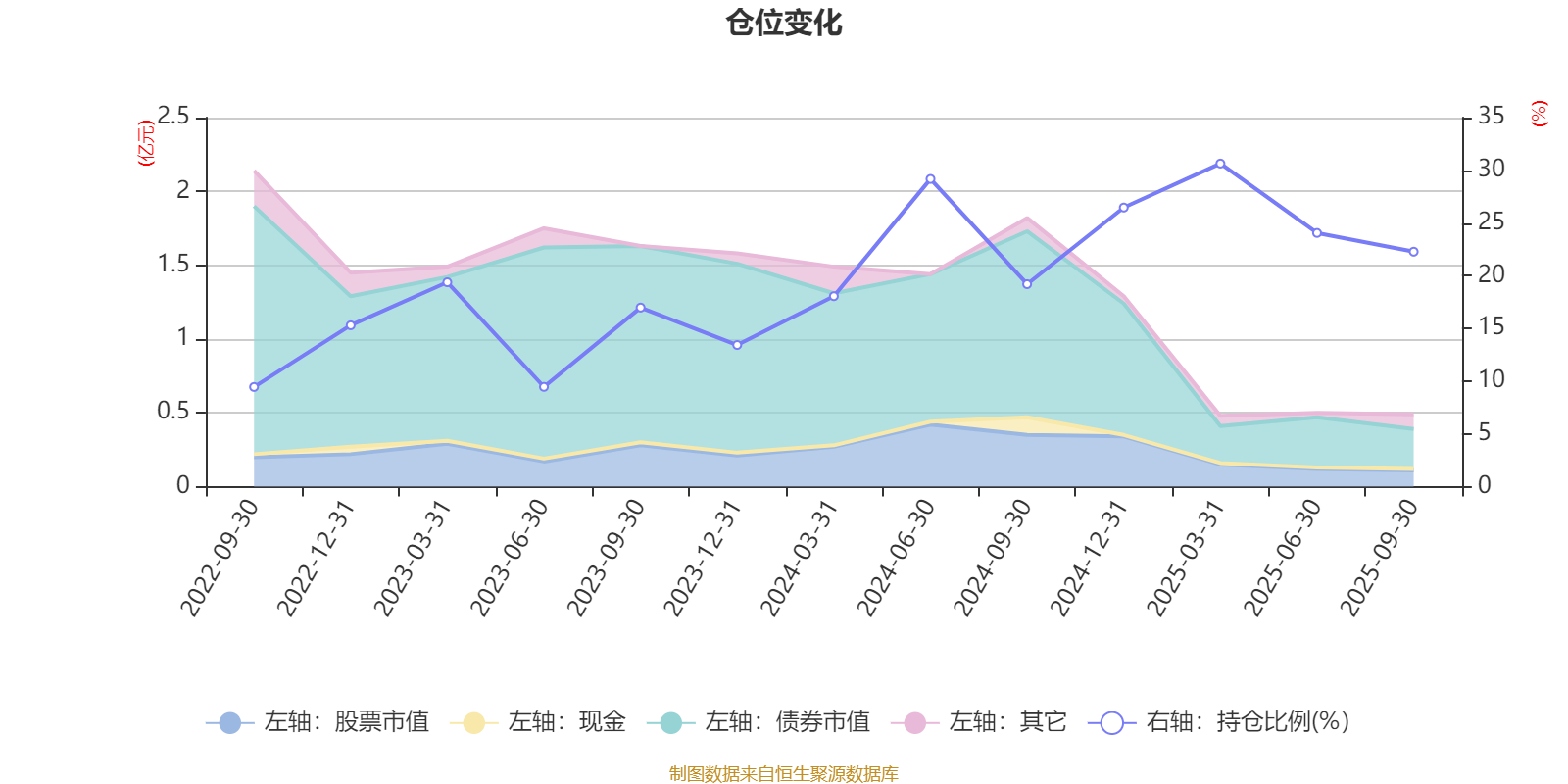 据定期报告数据统计,近三年平均股票仓位为20.37%,同类平均为19.03%。2025年一季度末基金达到30.64%的最高仓位,2022年三季度末最低,为9.45%。