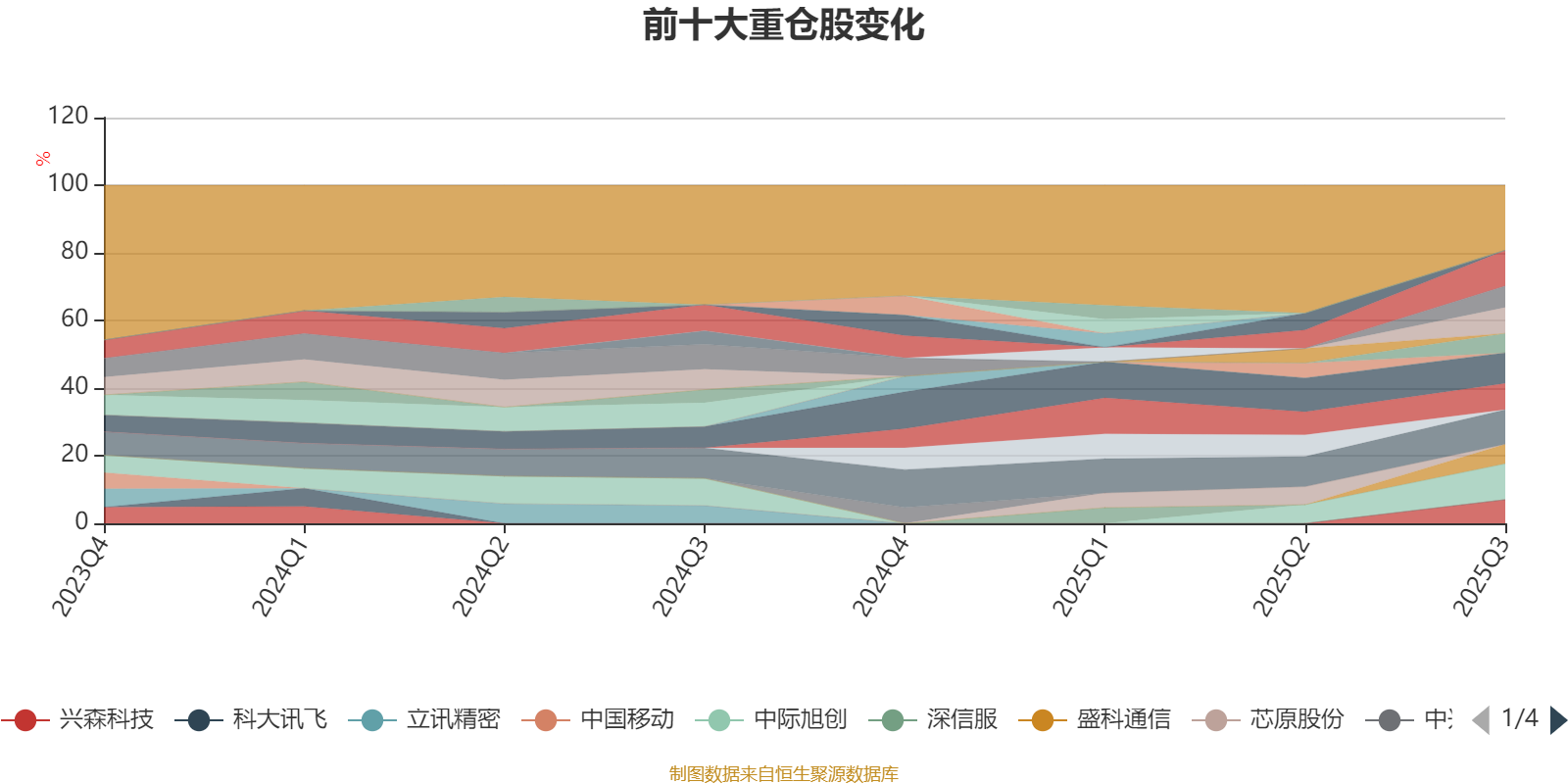 该基金持股集中度较高。截至2025年三季度末,基金十大重仓股分别是新易盛、中际旭创、寒武纪、海光信息、麦格米特、工业富联、兴森科技、天孚通信、盛科通信、中科曙光。