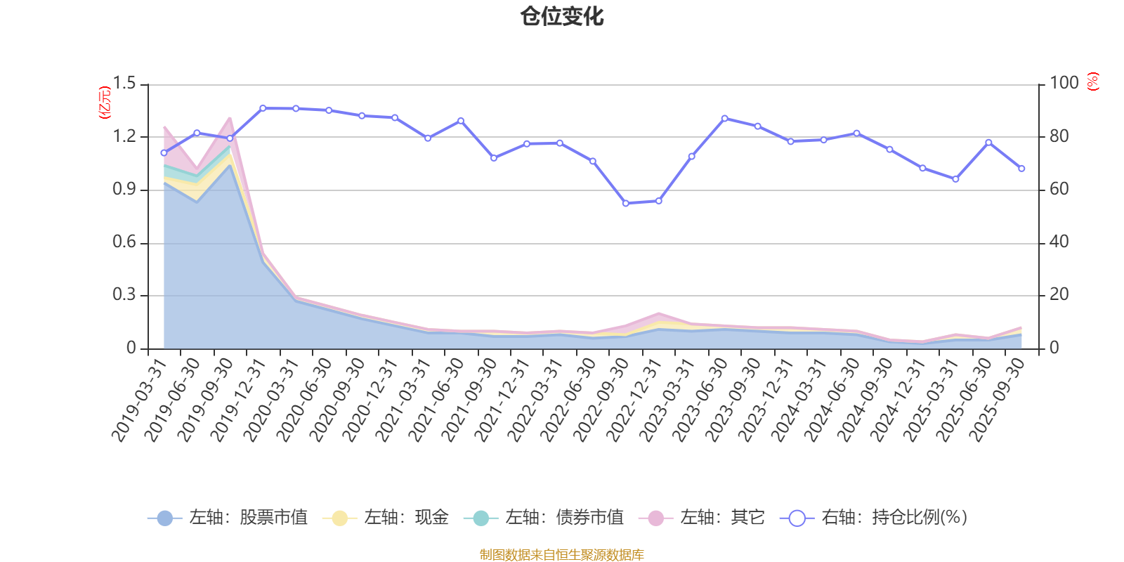 据定期报告数据统计,近三年平均股票仓位为74.41%,同类平均为83.41%。2019年末基金达到90.98%的最高仓位,2022年三季度末最低,为55%。