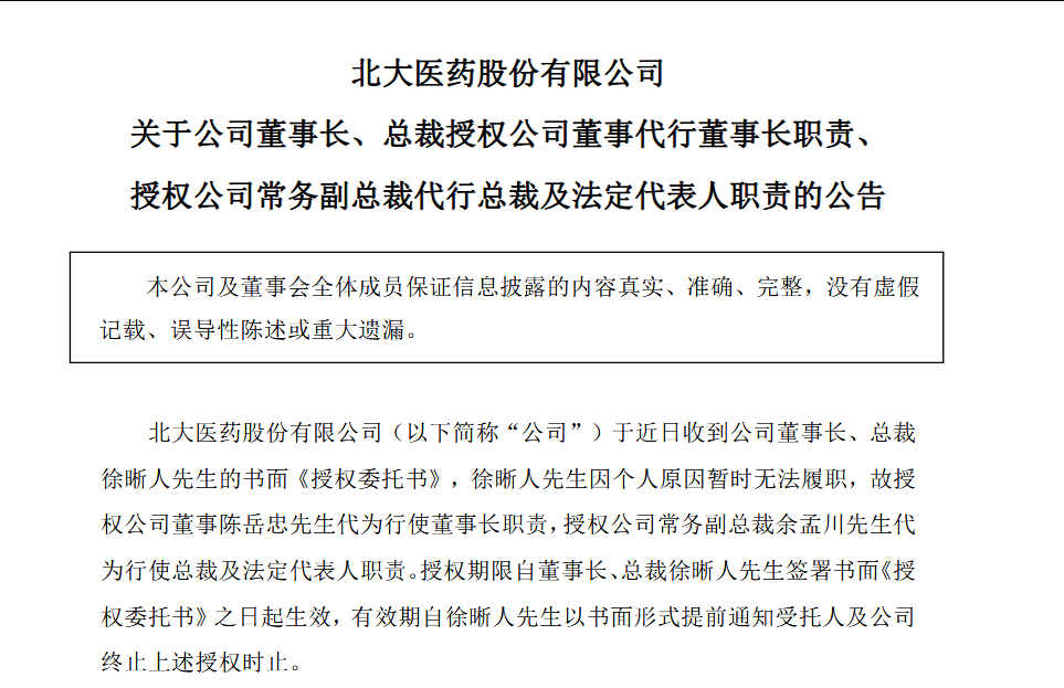 10月25日,北大医药发布关于公司董事长、总裁授权公司董事代行董事长职责、授权公司常务副总裁代行总裁及法定代表人职责的公告。