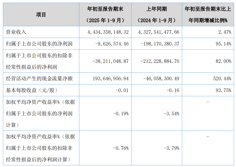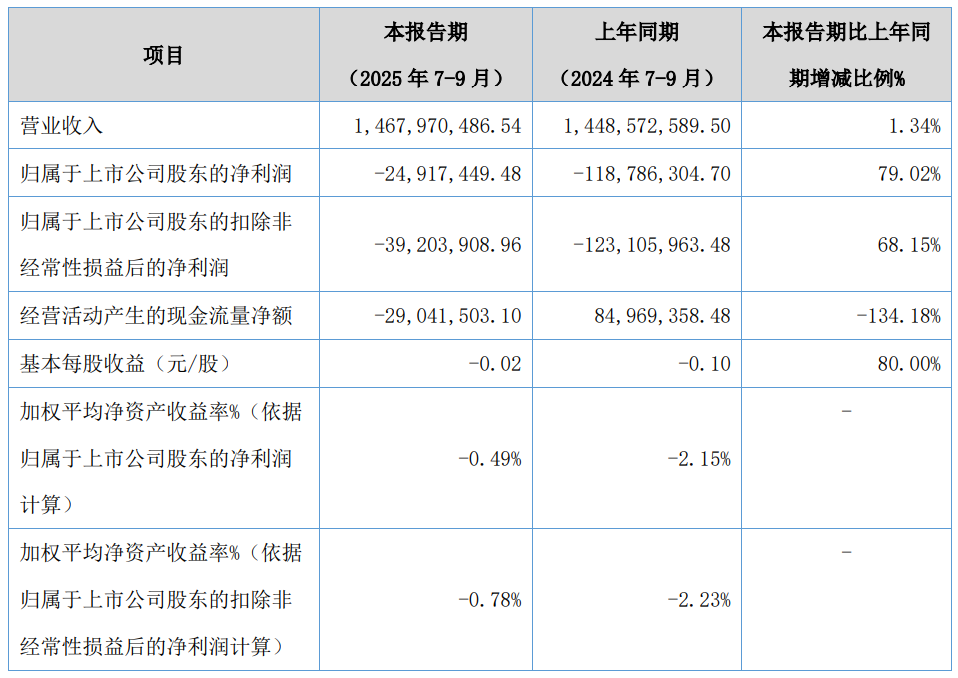 其中第三季度,公司营业收入为14.68亿元,同比上升1.34%;归母净利润为-2492万元,同比上升79.02%;扣非归母净利润为-3920万元,同比上升68.15%。