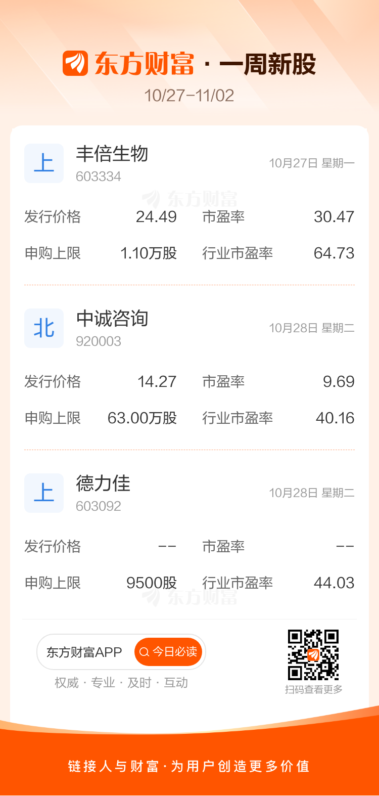 下周(10月27日至11月2日)沪深北三市有3只新股申购,分别为丰倍生物、中诚咨询、德力佳。