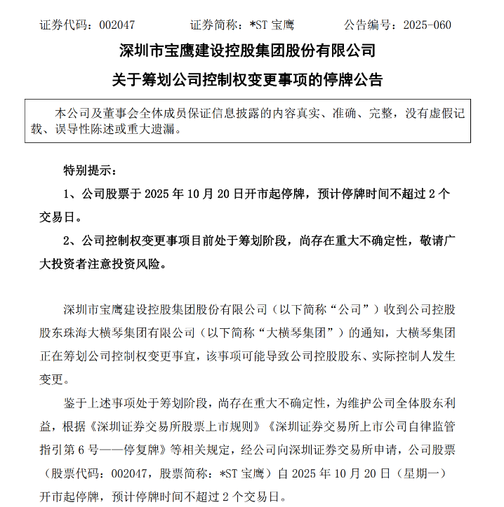 *ST宝鹰表示,鉴于上述事项处于筹划阶段,尚存在重大不确定性,为维护公司全体股东利益,根据相关规定,经公司向深圳证券交易所申请,公司股票自2025年10月20日(星期一)开市起停牌,预计停牌时间不超过2个交易日。