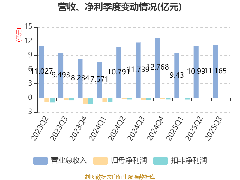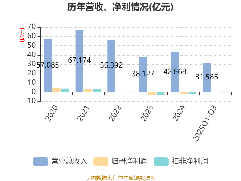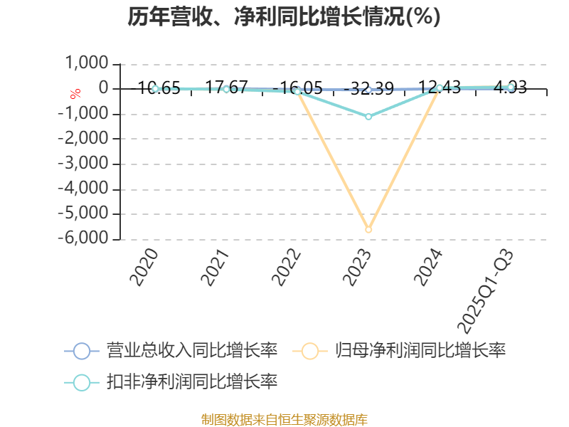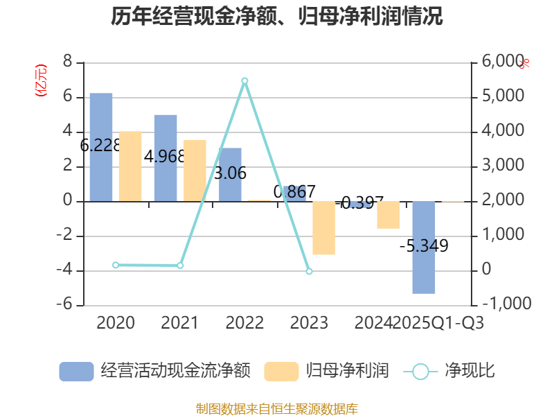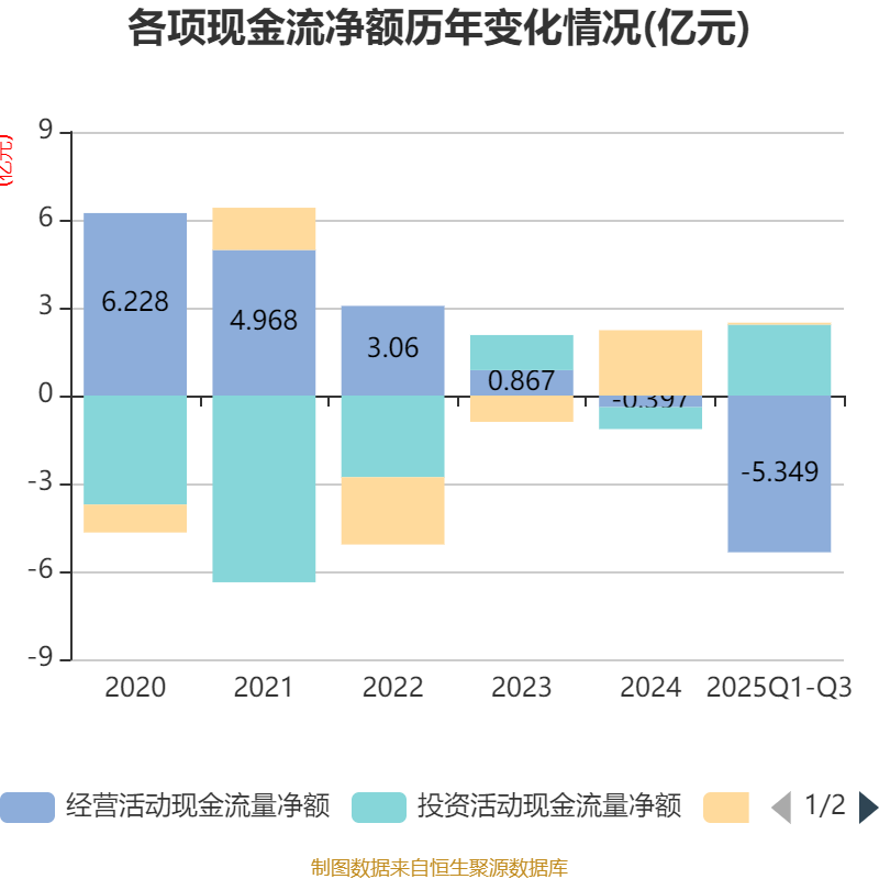 2025年前三季度,公司经营活动现金流净额为-5.35亿元,同比增加4348.88万元;筹资活动现金流净额657.69万元,同比减少1.16亿元;投资活动现金流净额2.42亿元,上年同期为2.59亿元。