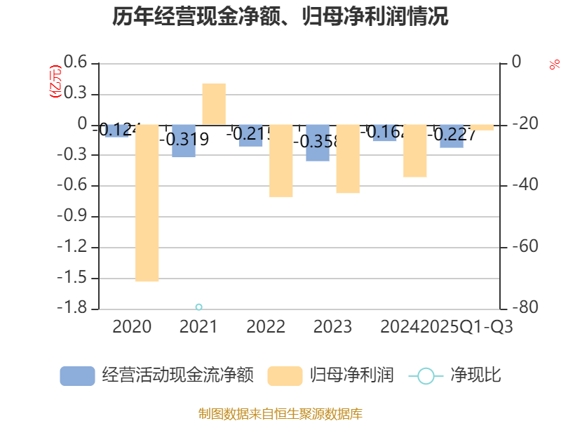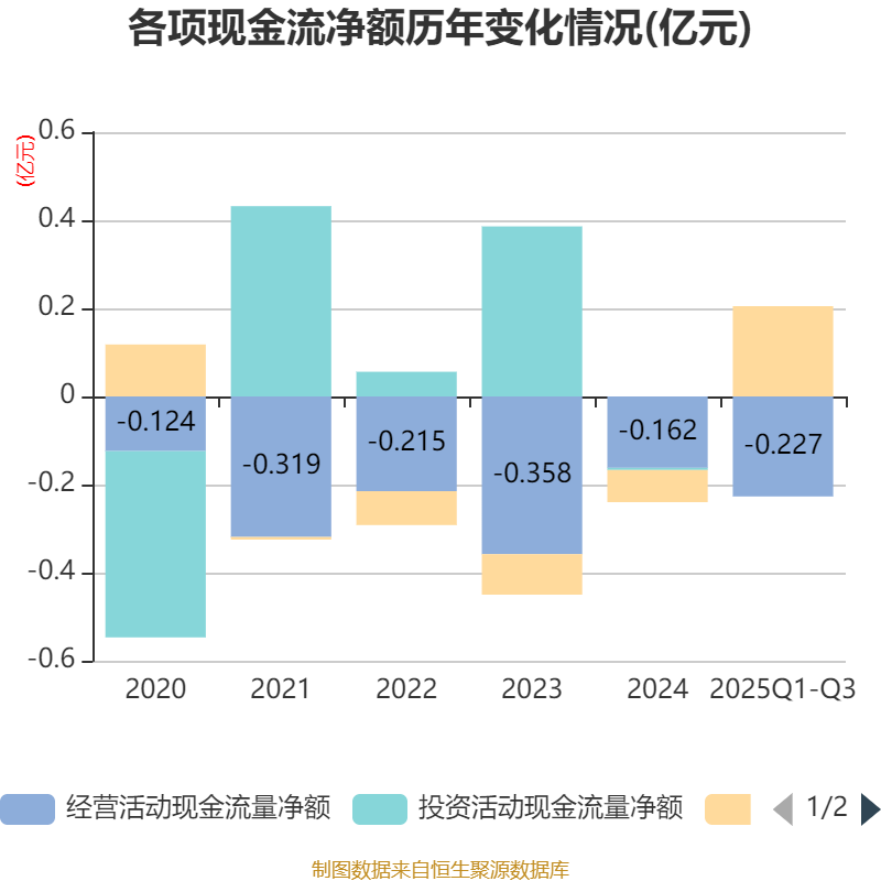 2025年前三季度,公司经营活动现金流净额为-2272.07万元,同比减少775.46万元;筹资活动现金流净额2046.2万元,同比增加3188万元;投资活动现金流净额-3700元,上年同期为-16.15万元。
