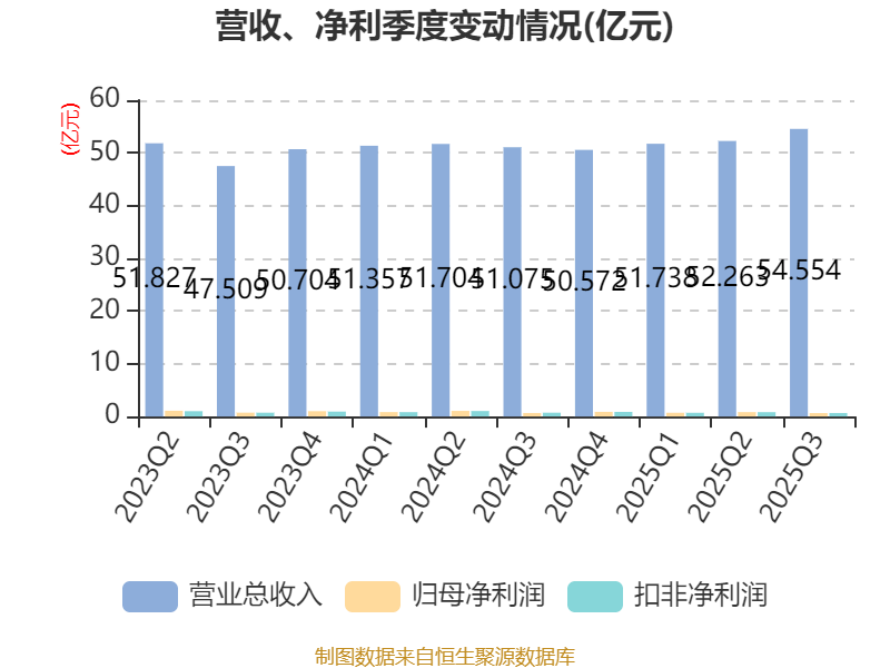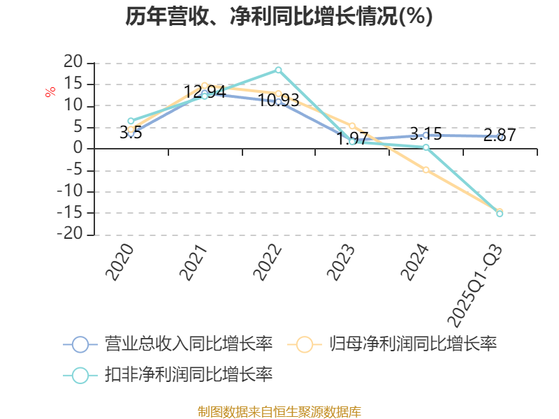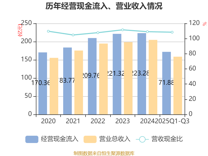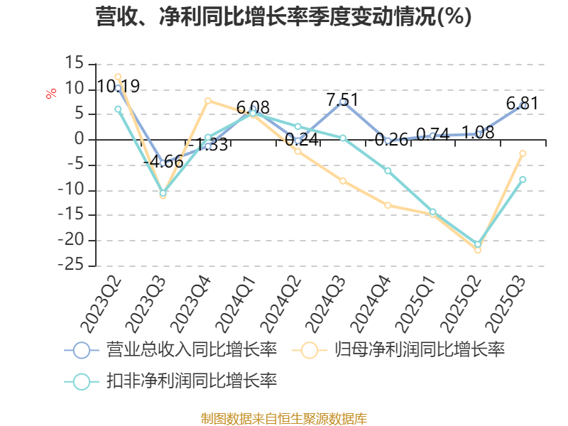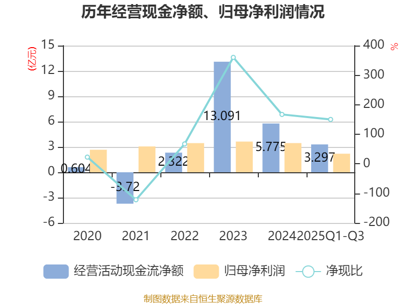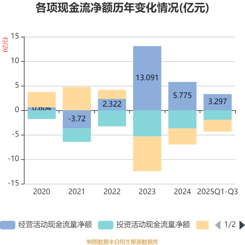 2025年前三季度,公司经营活动现金流净额为3.3亿元,同比增长10.74%;筹资活动现金流净额-2.43亿元,同比减少1.21亿元;投资活动现金流净额-1.93亿元,上年同期为-3.02亿元。
