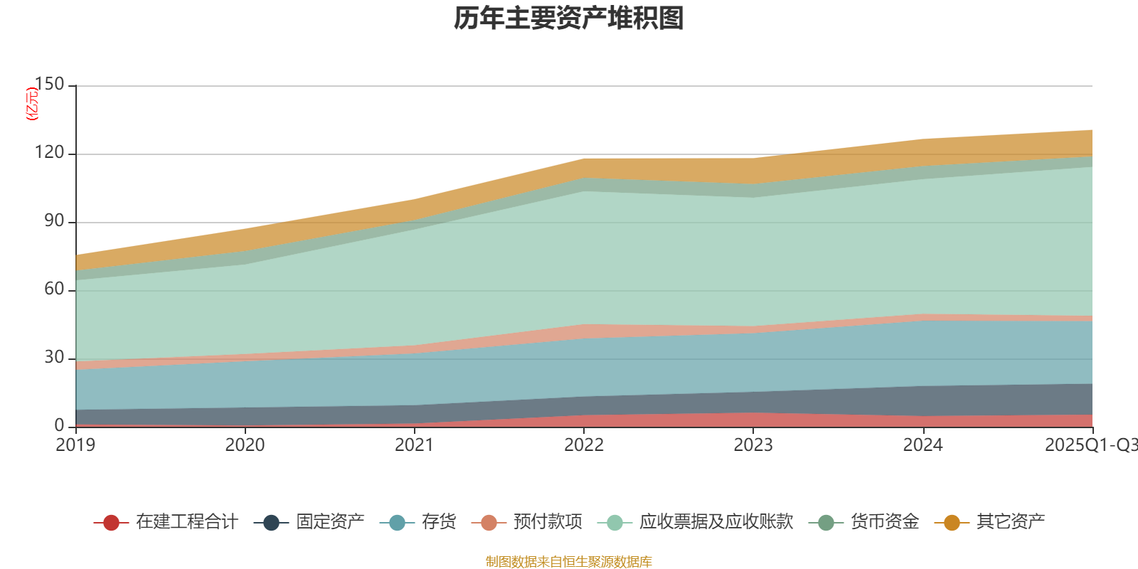 资产重大变化方面,截至2025年三季度末,公司应收票据及应收账款较上年末增加10.69%,占公司总资产比重上升3.4个百分点;存货较上年末减少4.03%,占公司总资产比重下降1.59个百分点;货币资金较上年末减少20.4%,占公司总资产比重下降1.04个百分点;预付款项较上年末减少23.48%,占公司总资产比重下降0.63个百分点。