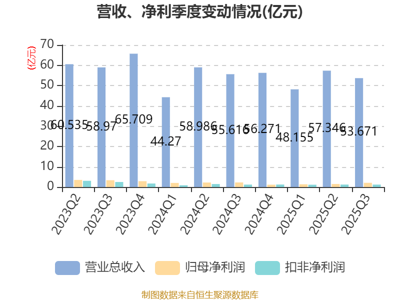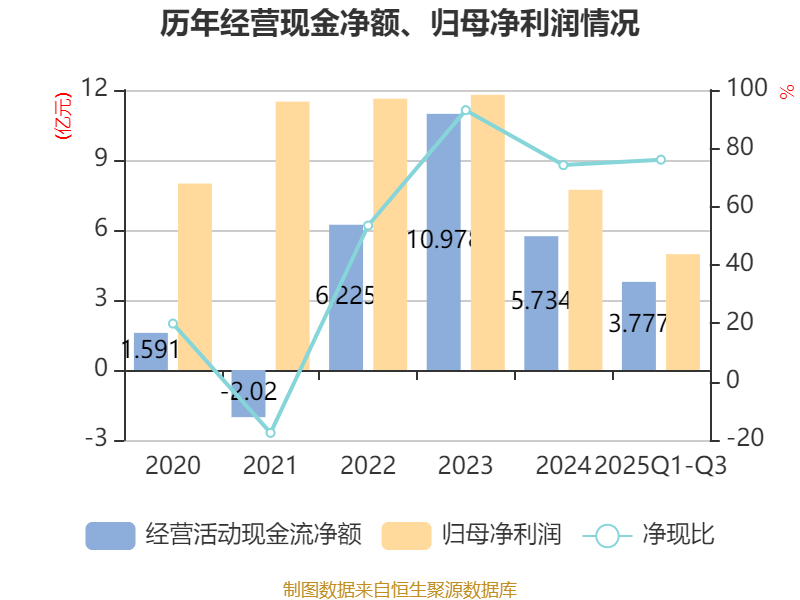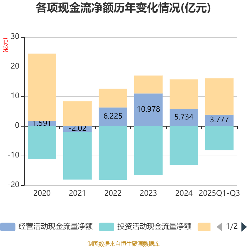2025年前三季度,公司经营活动现金流净额为3.78亿元,同比增长15.44%;筹资活动现金流净额12.31亿元,同比减少5.49亿元;投资活动现金流净额-8.19亿元,上年同期为-10.46亿元。