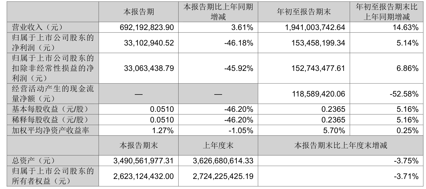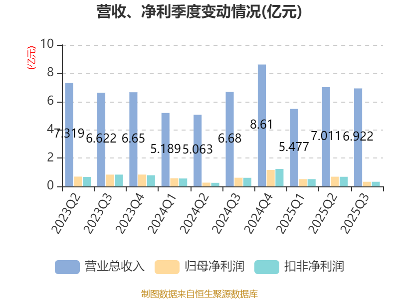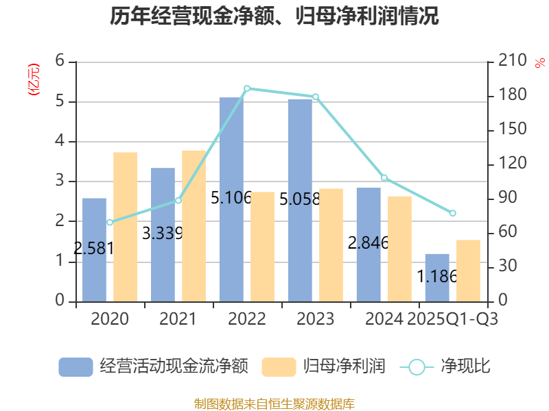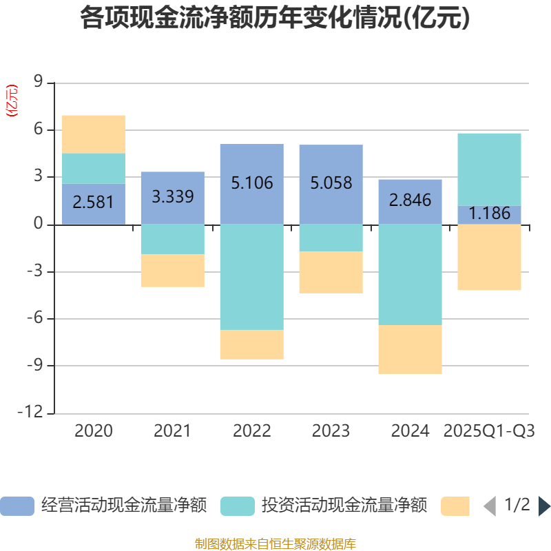 2025年前三季度,公司经营活动现金流净额为1.19亿元,同比下降52.58%;筹资活动现金流净额-4.18亿元,同比减少1.42亿元;投资活动现金流净额4.59亿元,上年同期为-5.37亿元。