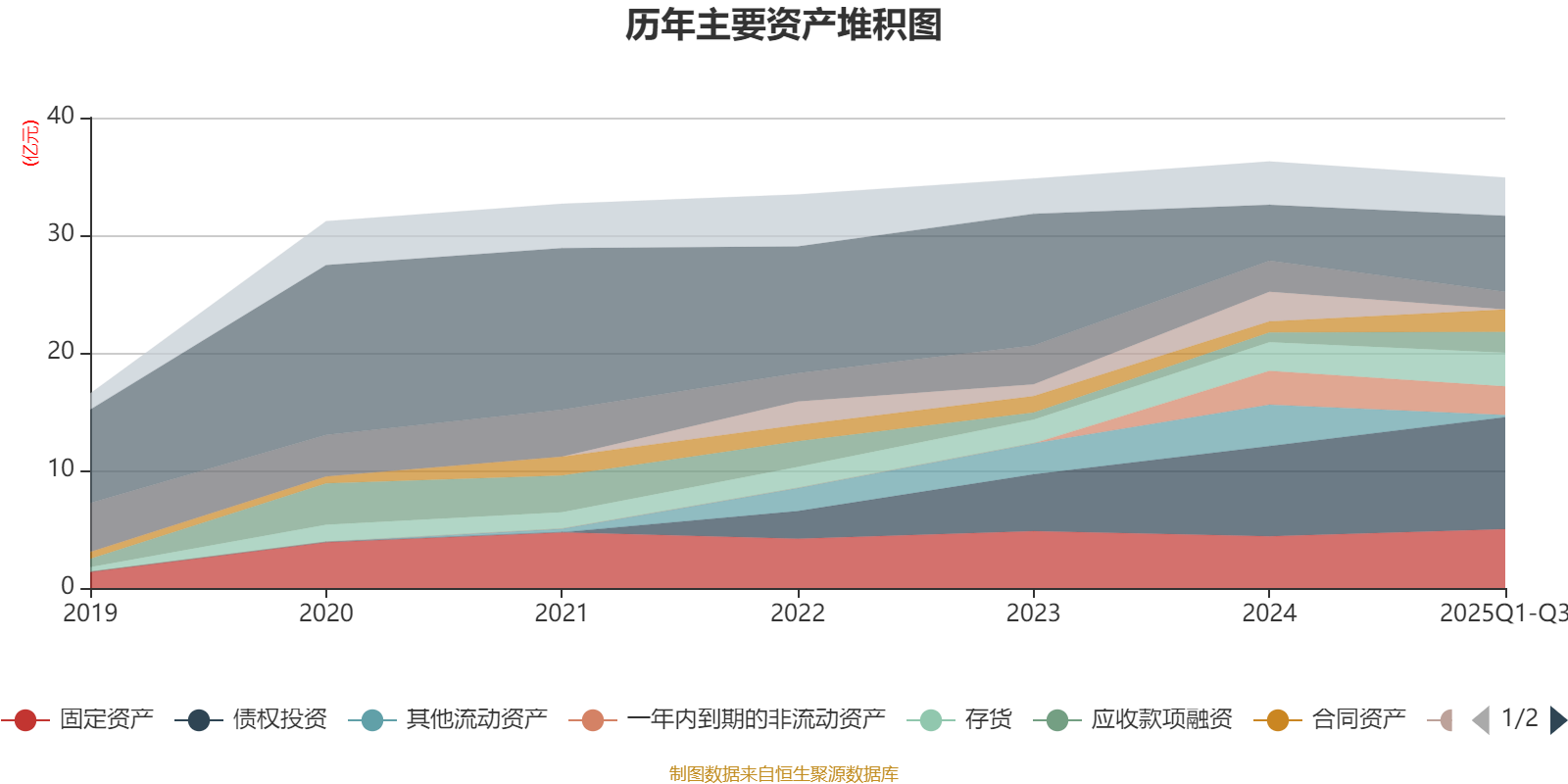 资产重大变化方面,截至2025年三季度末,公司其他流动资产较上年末减少94.66%,占公司总资产比重下降9.2个百分点;交易性金融资产合计较上年末减少100%,占公司总资产比重下降6.94个百分点;债权投资较上年末增加24.14%,占公司总资产比重上升6.13个百分点;货币资金较上年末增加36.29%,占公司总资产比重上升5.44个百分点。
