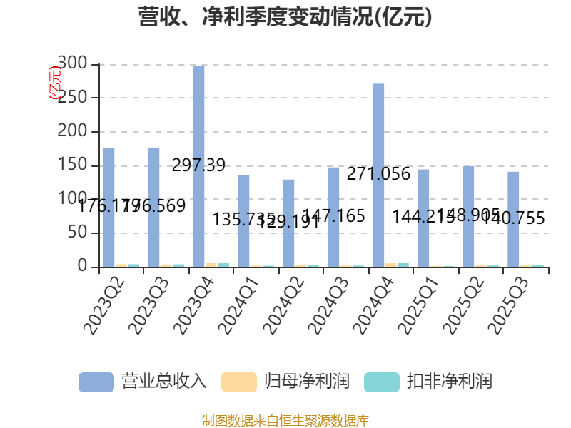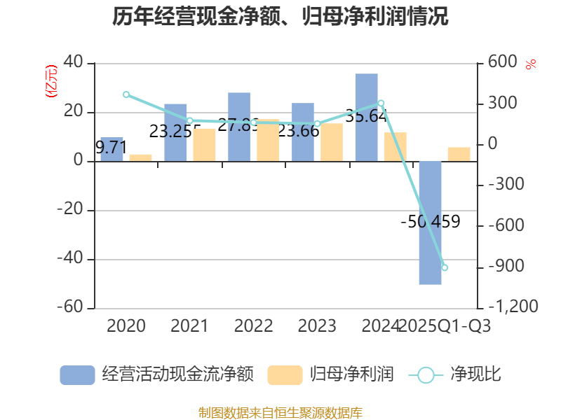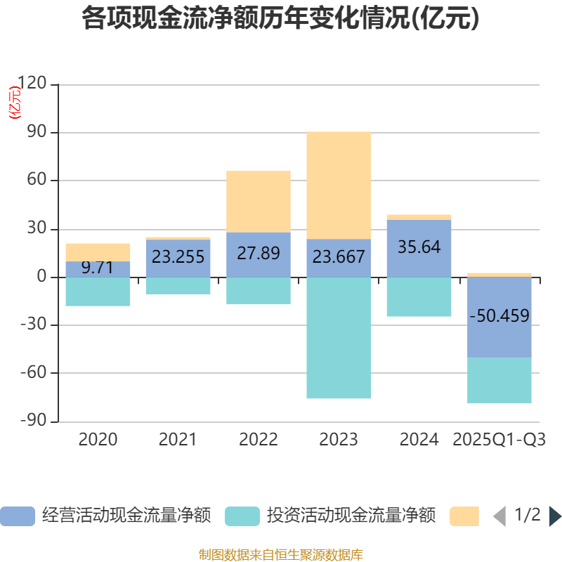 2025年前三季度,公司经营活动现金流净额为-50.46亿元,同比减少42.24亿元;筹资活动现金流净额2.44亿元,同比增加6.83亿元;投资活动现金流净额-28.19亿元,上年同期为-19.75亿元。