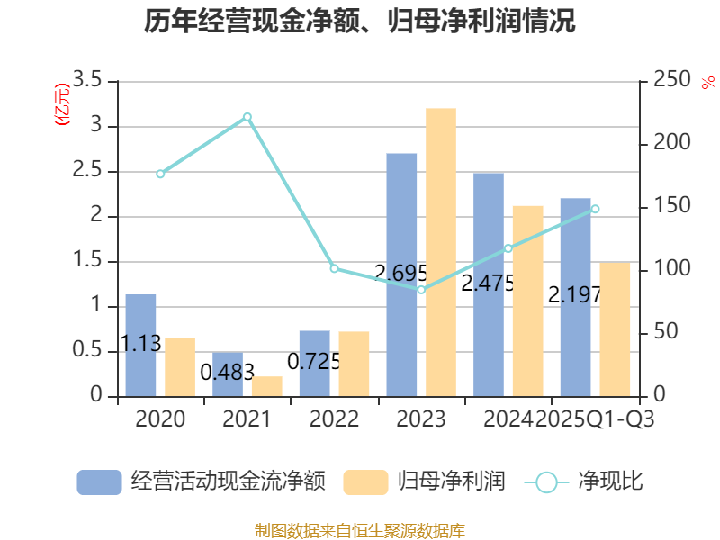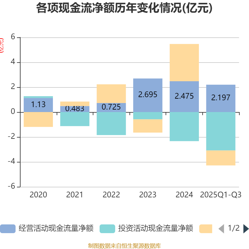 2025年前三季度,公司经营活动现金流净额为2.2亿元,同比增长33.87%;筹资活动现金流净额-1.2亿元,同比减少5.59亿元;投资活动现金流净额-3.09亿元,上年同期为-2.65亿元。