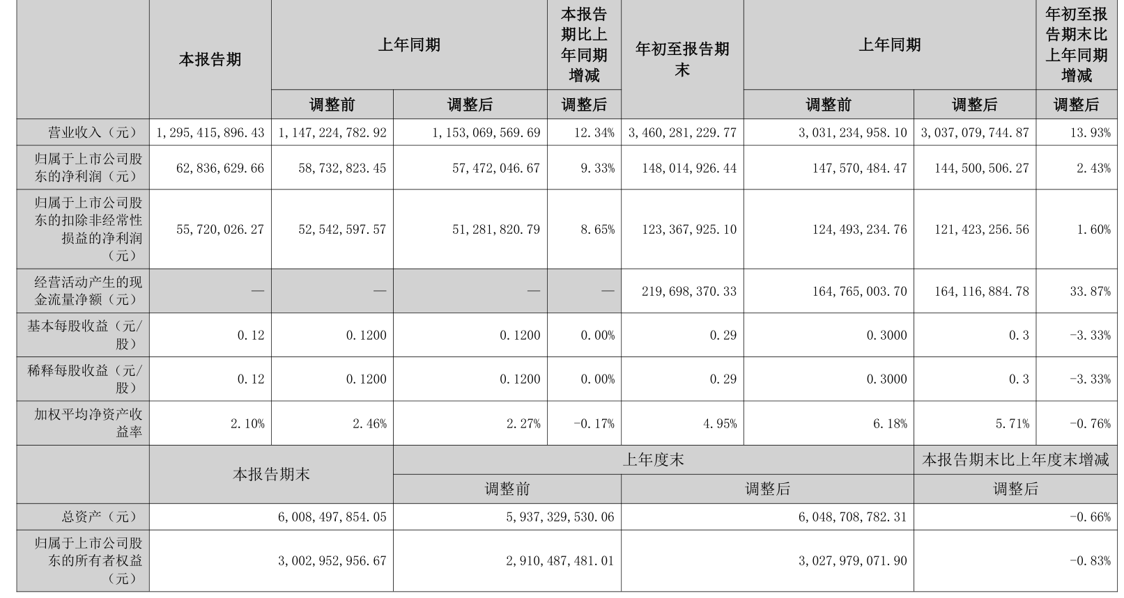 中证智能财讯万安科技(002590)10月27日披露2025年第三季度报告。前三季度公司实现营业总收入34.6亿元,同比增长13.93%;归母净利润1.48亿元,同比增长2.43%;扣非净利润1.23亿元,同比增长1.60%;经营活动产生的现金流量净额为2.2亿元,同比增长33.87%;报告期内,万安科技基本每股收益为0.29元,加权平均净资产收益率为4.95%。