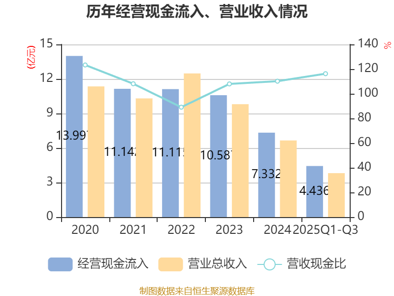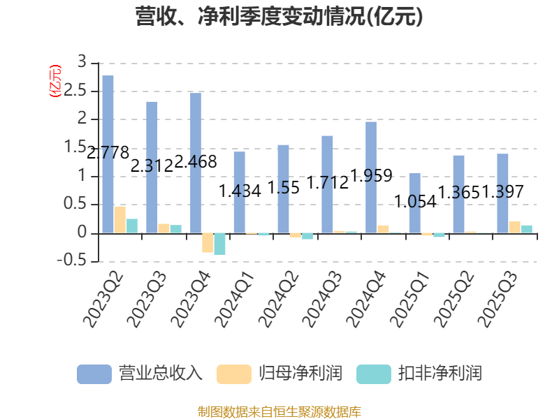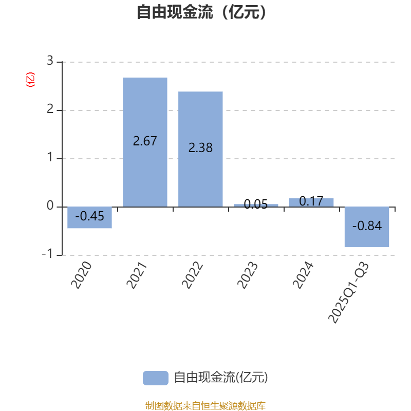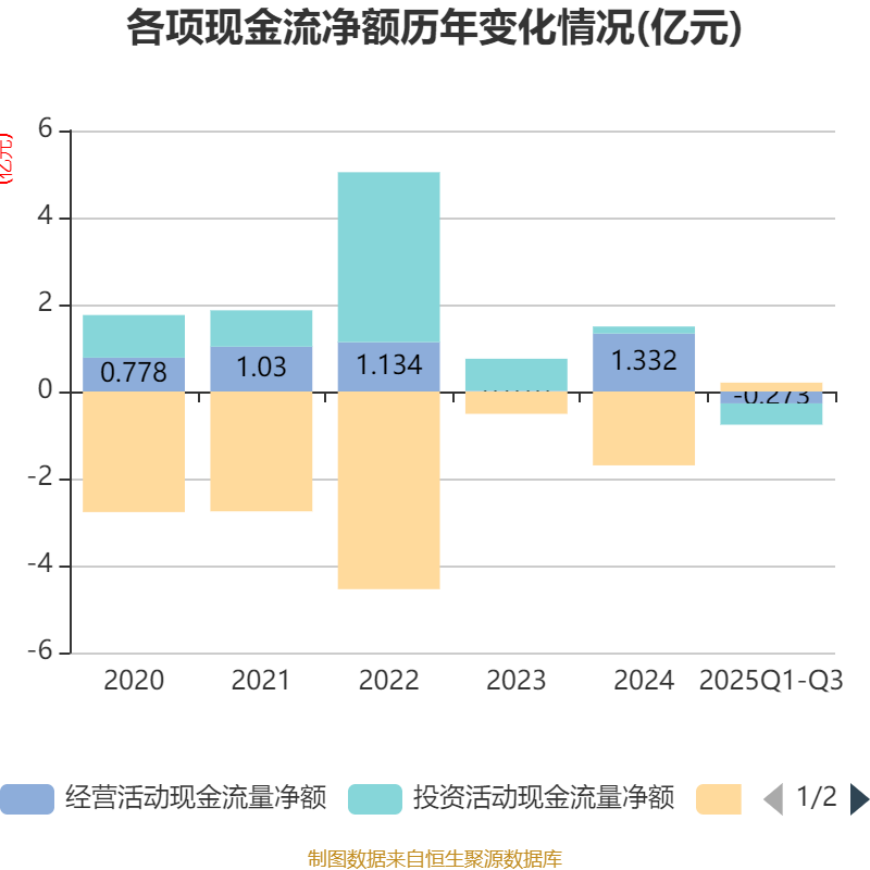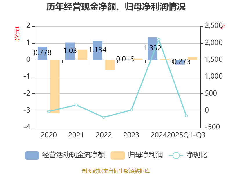 2025年前三季度,公司经营活动现金流净额为-2725.86万元,同比减少7552.74万元;筹资活动现金流净额2036.92万元,同比增加1.04亿元;投资活动现金流净额-4900.88万元,上年同期为-5712.4万元。