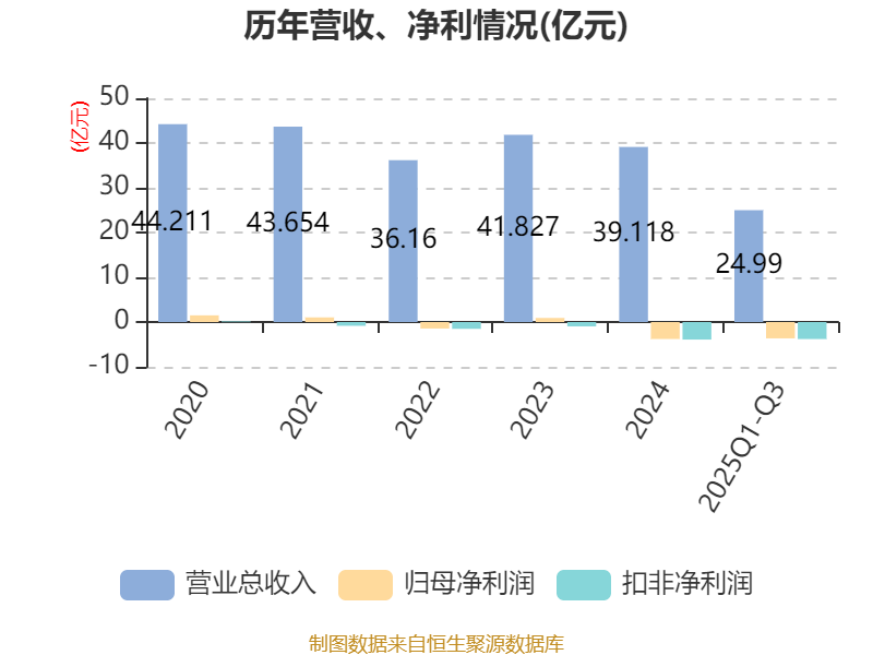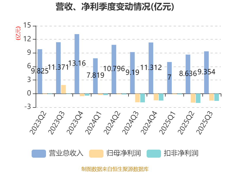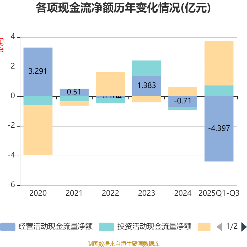 2025年前三季度,公司经营活动现金流净额为-4.4亿元,同比增加1.64亿元;筹资活动现金流净额2.99亿元,同比增加2.13亿元;投资活动现金流净额7441.97万元,上年同期为-2364.63万元。