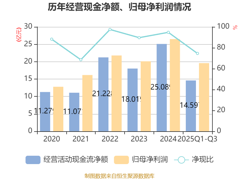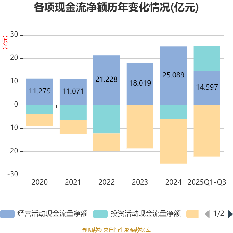 2025年前三季度,公司经营活动现金流净额为14.6亿元,同比下降25.93%;筹资活动现金流净额-22.21亿元,同比减少3.22亿元;投资活动现金流净额10.63亿元,上年同期为5896.42万元。