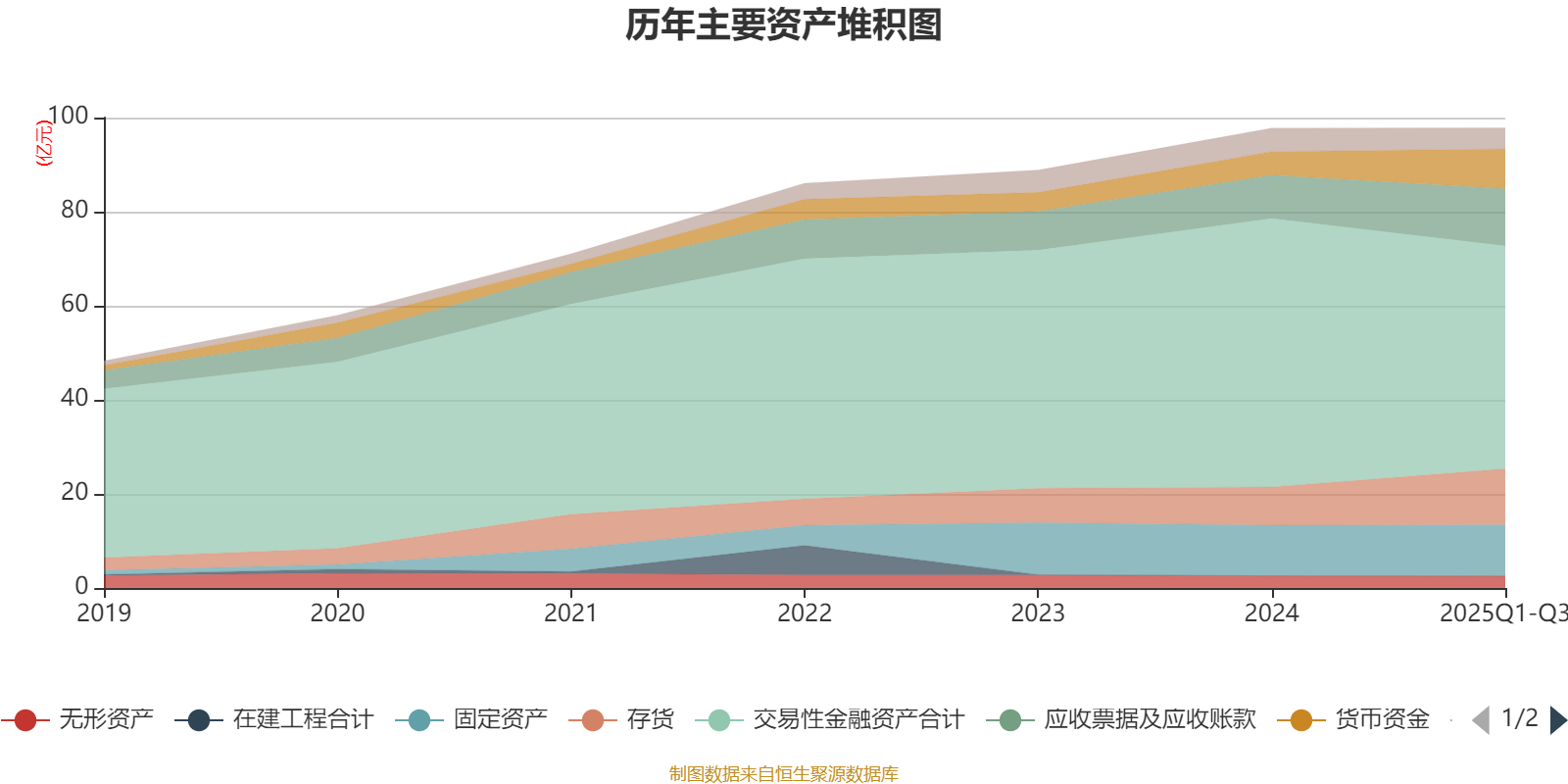资产重大变化方面,截至2025年三季度末,公司交易性金融资产合计较上年末减少16.99%,占公司总资产比重下降9.97个百分点;存货较上年末增加46.59%,占公司总资产比重上升3.87个百分点;货币资金较上年末增加68.19%,占公司总资产比重上升3.49个百分点;应收票据及应收账款较上年末增加32.06%,占公司总资产比重上升3.01个百分点。