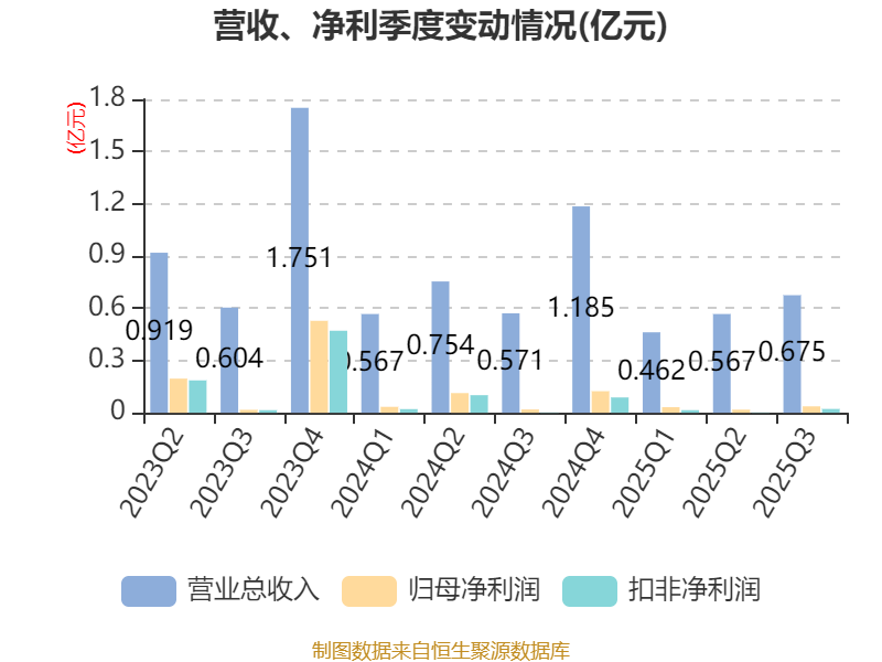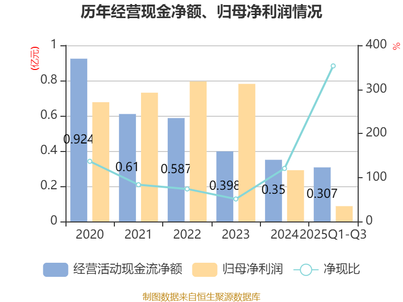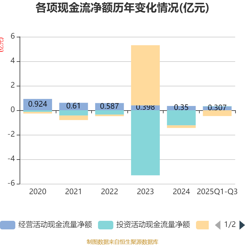 2025年前三季度,公司经营活动现金流净额为3074.39万元,同比增加3918.59万元;筹资活动现金流净额-4727.57万元,同比减少3748.41万元;投资活动现金流净额294.99万元,上年同期为-1.32亿元。