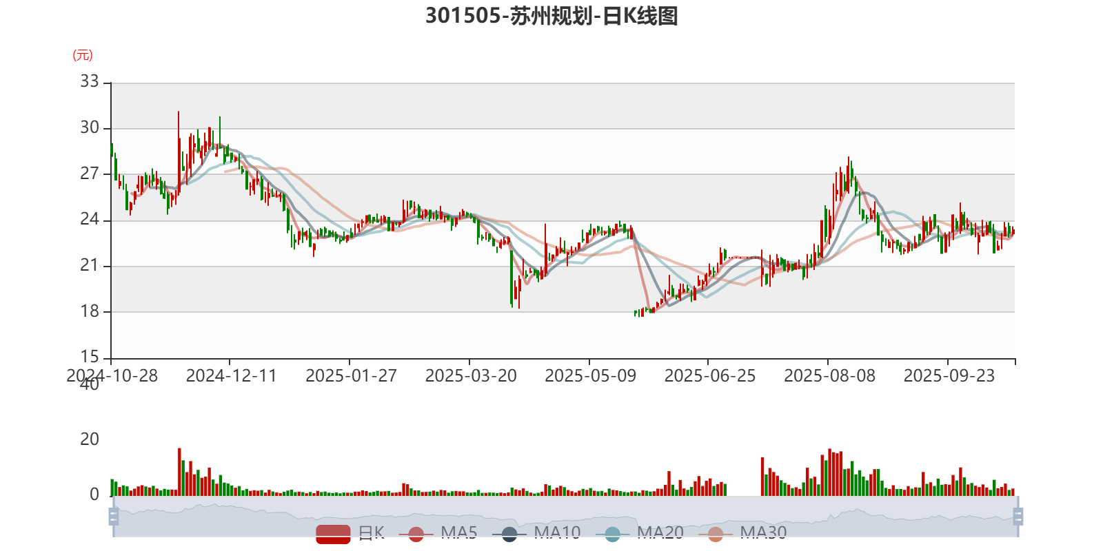 中证智能财讯苏州规划(301505)10月27日披露2025年第三季度报告。前三季度公司实现营业总收入1.7亿元,同比下降9.99%;归母净利润870.44万元,同比下降47.66%;扣非净利润377.6万元,同比下降69.49%;经营活动产生的现金流量净额为3074.39万元,上年同期为-844.2万元;报告期内,苏州规划基本每股收益为0.08元,加权平均净资产收益率为0.89%。