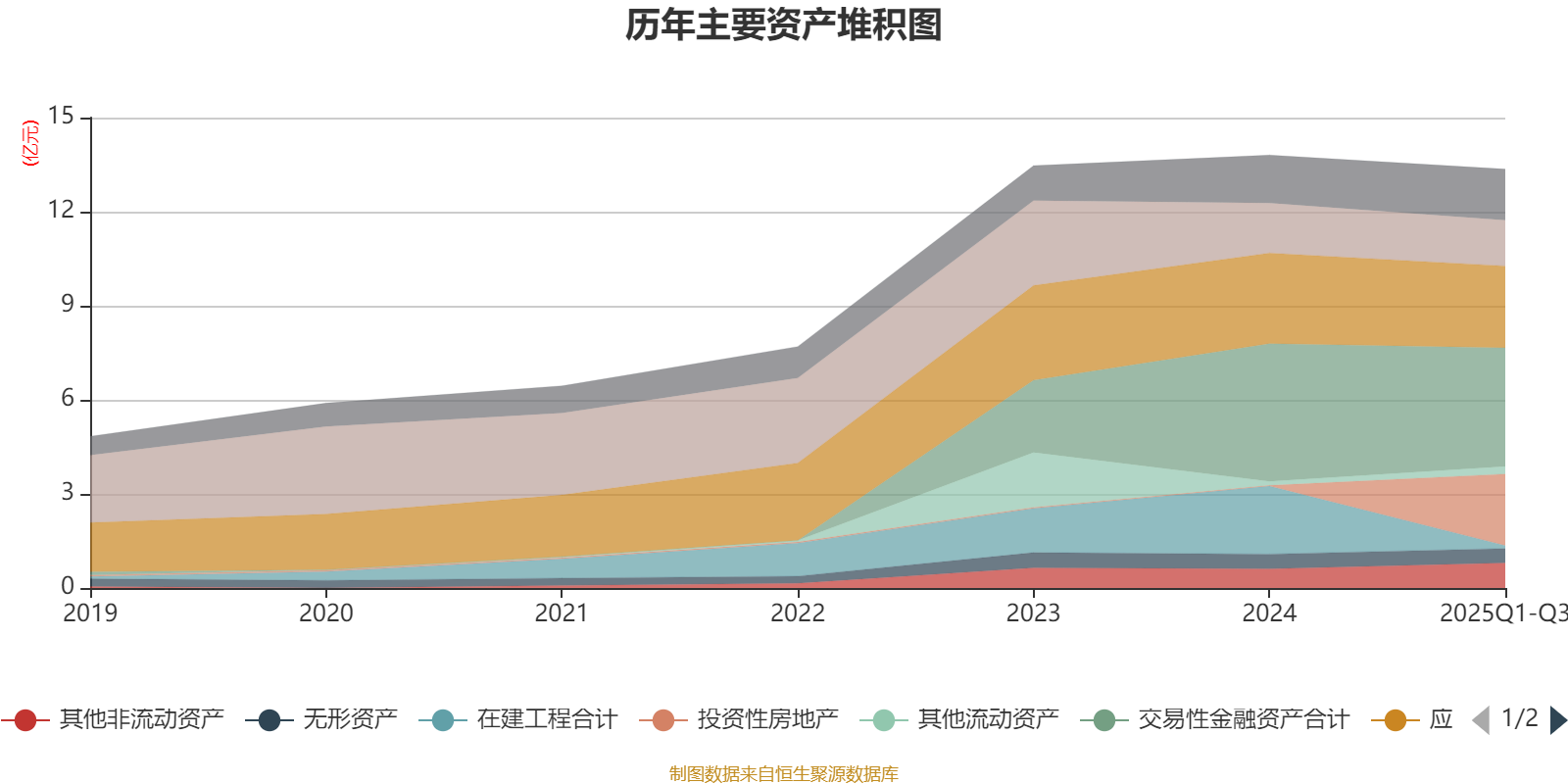 资产重大变化方面,截至2025年三季度末,公司投资性房地产较上年末增加10448.42%,占公司总资产比重上升16.91个百分点;在建工程合计较上年末减少95.62%,占公司总资产比重下降14.98个百分点;交易性金融资产合计较上年末减少13.83%,占公司总资产比重下降3.49个百分点;其他非流动资产较上年末增加30.71%,占公司总资产比重上升1.56个百分点。