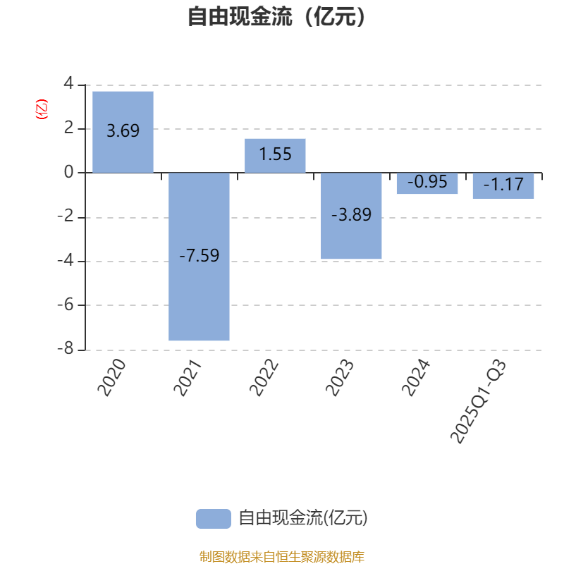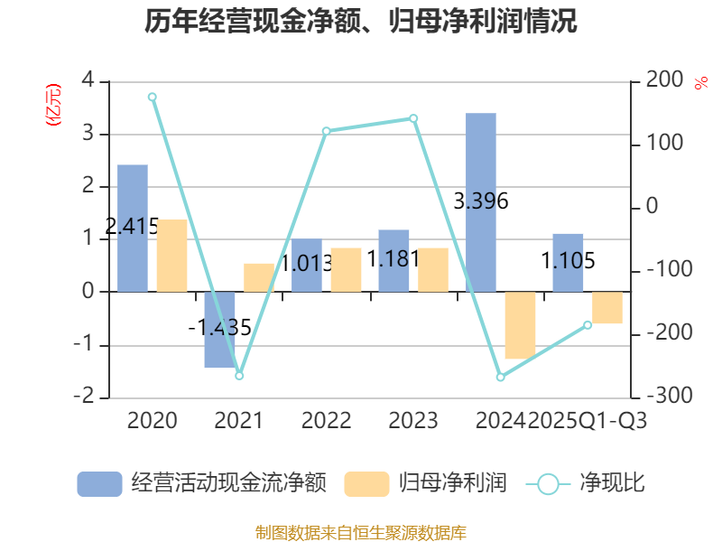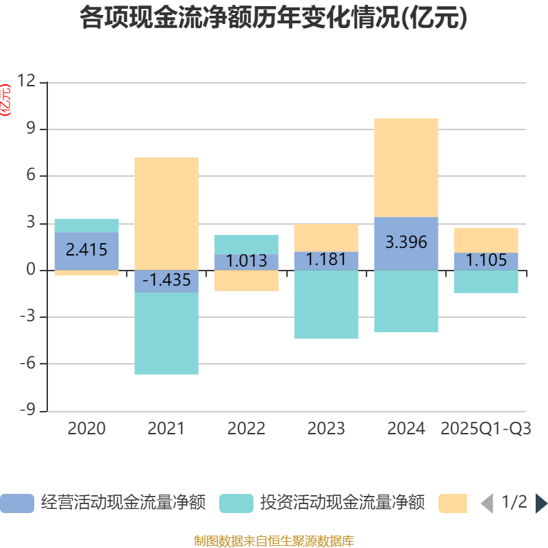 2025年前三季度,公司经营活动现金流净额为1.11亿元,同比下降68.64%;筹资活动现金流净额1.58亿元,同比减少2.37亿元;投资活动现金流净额-1.47亿元,上年同期为-3.09亿元。