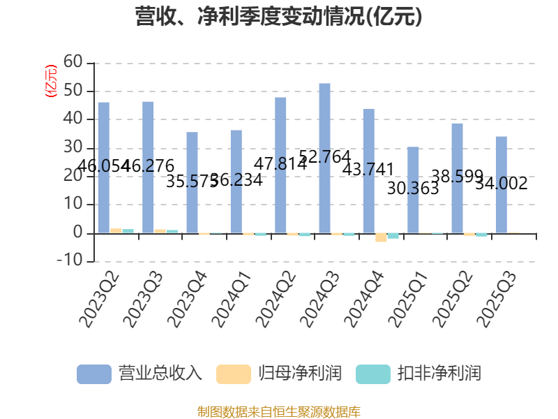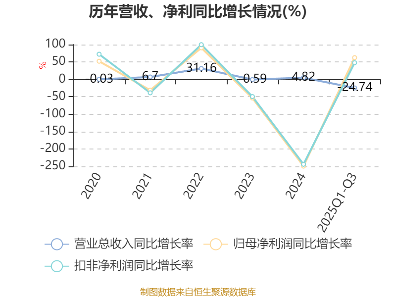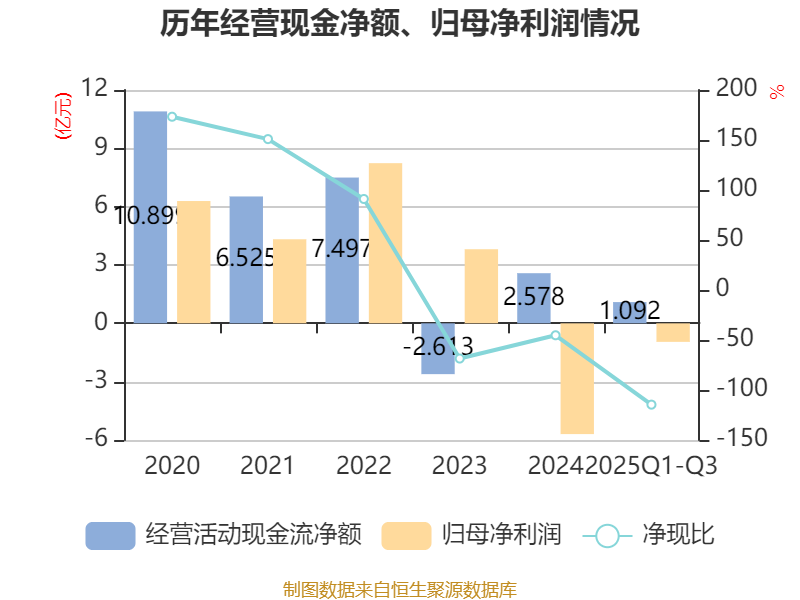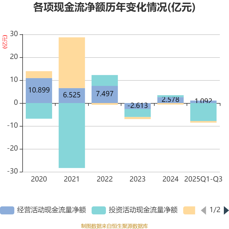 2025年前三季度,公司经营活动现金流净额为1.09亿元,同比下降84.35%;筹资活动现金流净额-6946.34万元,同比增加180.4万元;投资活动现金流净额-7.86亿元,上年同期为-2.35亿元。