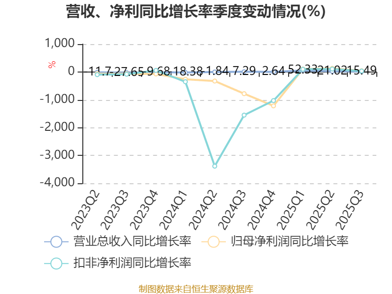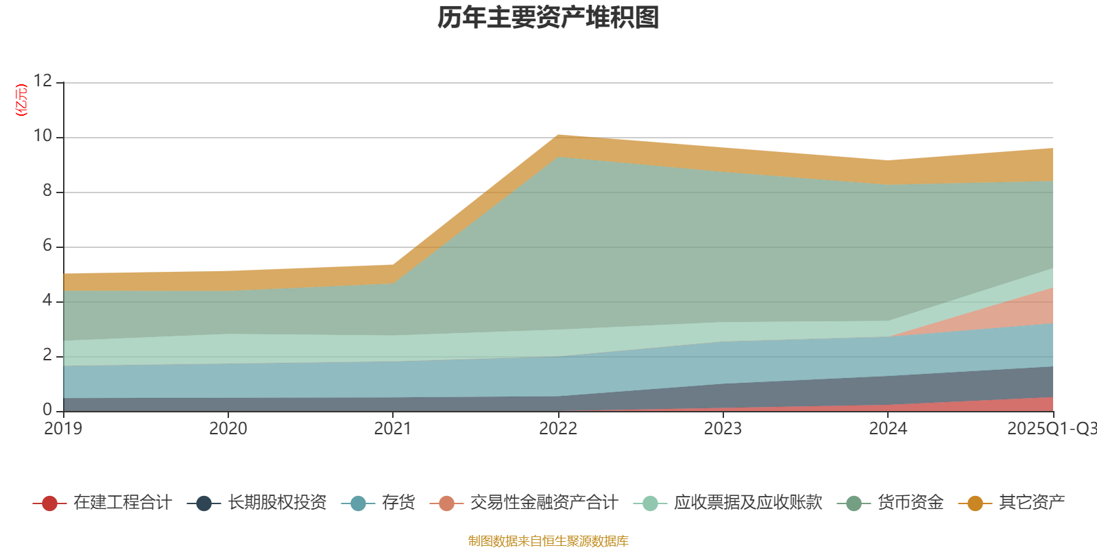 资产重大变化方面,截至2025年三季度末,公司货币资金较上年末减少35.93%,占公司总资产比重下降21.16个百分点;交易性金融资产合计占公司总资产的13.65%,上年末为0;在建工程合计较上年末增加129.75%,占公司总资产比重上升2.88个百分点;预付款项较上年末增加56.66%,占公司总资产比重上升1.43个百分点。