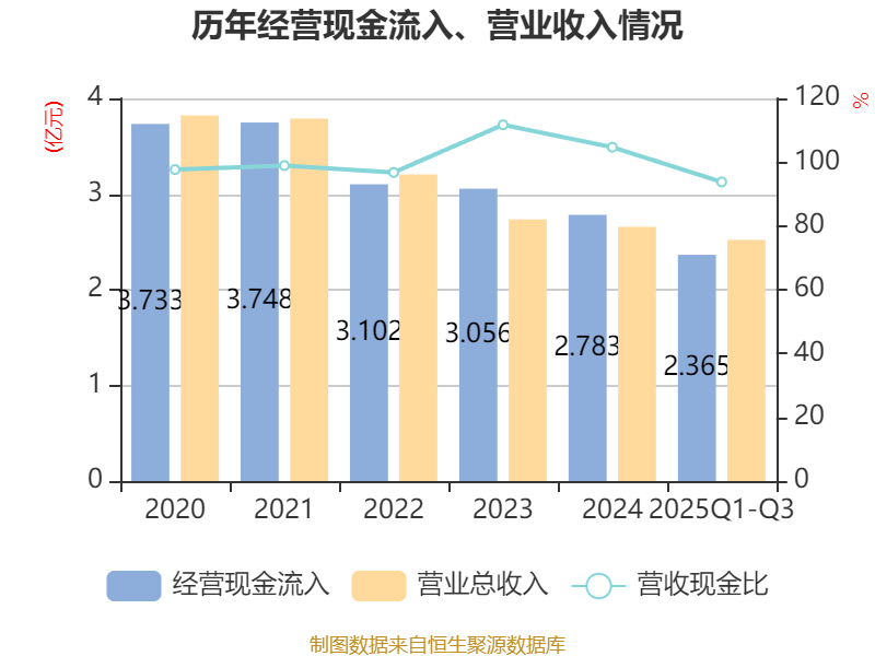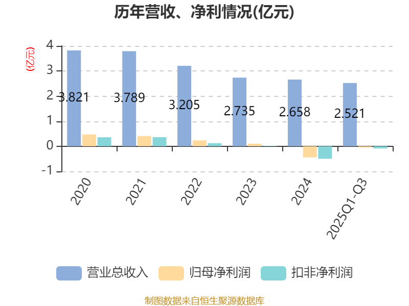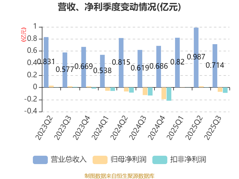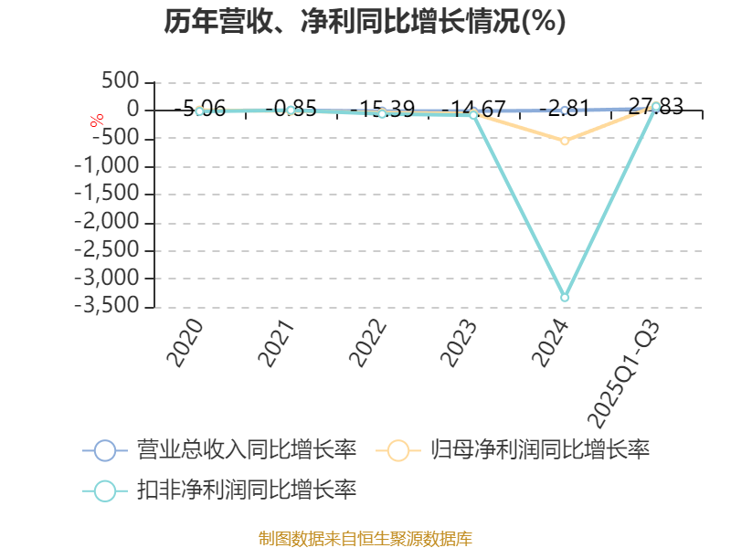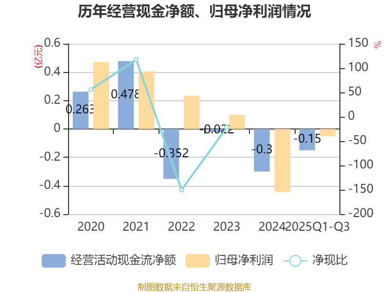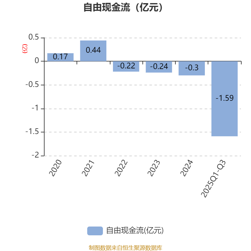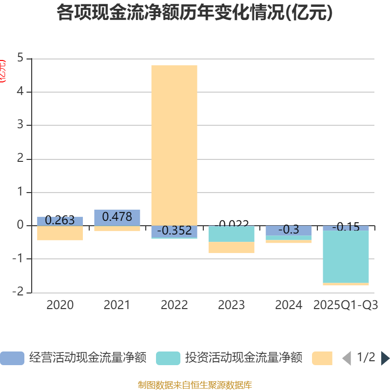 2025年前三季度,公司经营活动现金流净额为-1504.17万元,同比增加4286.41万元;筹资活动现金流净额-702.62万元,同比增加36.86万元;投资活动现金流净额-1.56亿元,上年同期为-2.86亿元。