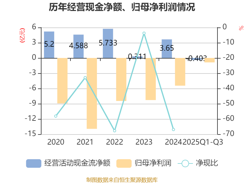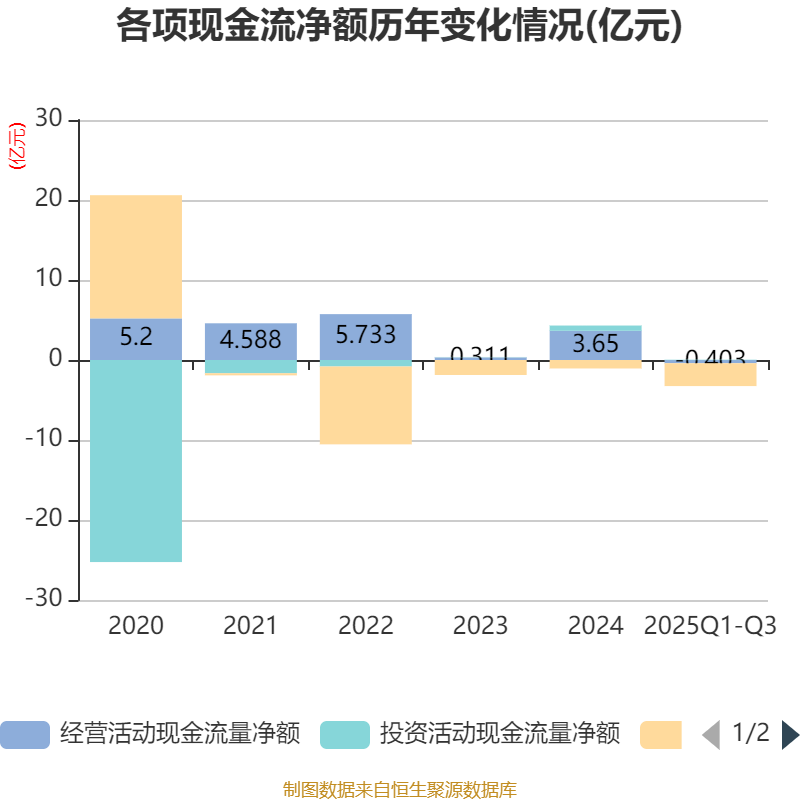 2025年前三季度,公司经营活动现金流净额为-4029.26万元,同比增加8266.47万元;筹资活动现金流净额-2.86亿元,同比减少4.89亿元;投资活动现金流净额496.2万元,上年同期为574.46万元。