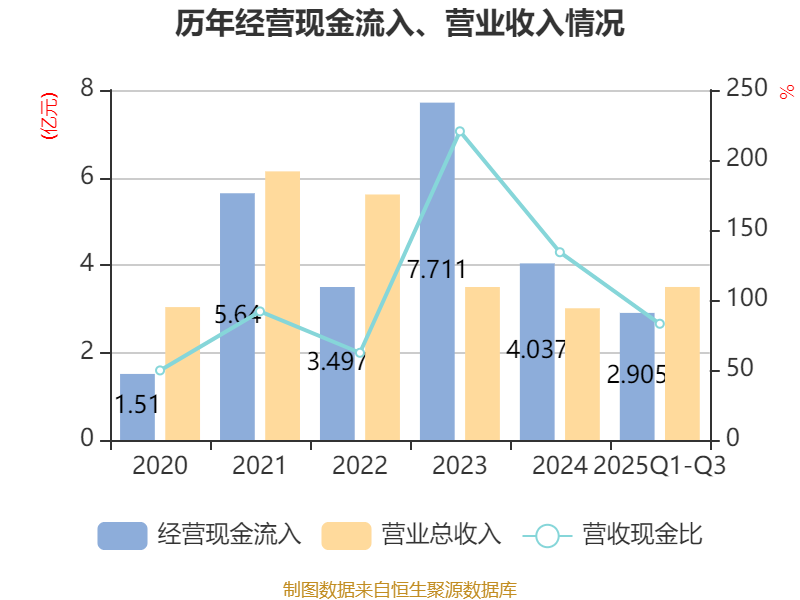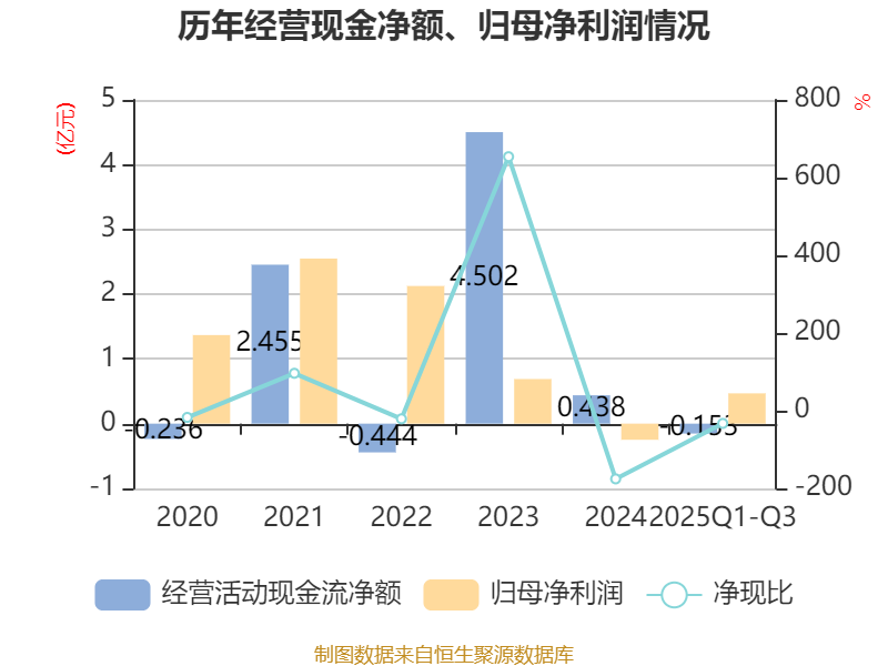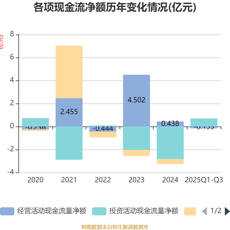 2025年前三季度,公司经营活动现金流净额为-1531.06万元,同比减少3364.87万元;筹资活动现金流净额-246.68万元,同比增加2962.35万元;投资活动现金流净额7014.11万元,上年同期为-8535.78万元。
