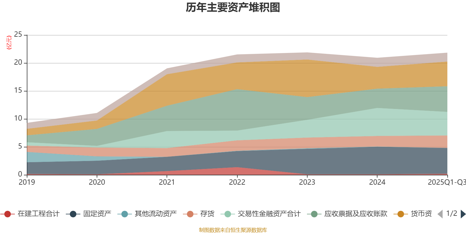 资产重大变化方面,截至2025年三季度末,公司交易性金融资产合计较上年末减少15.63%,占公司总资产比重下降4.59个百分点;应收票据及应收账款较上年末增加32.51%,占公司总资产比重上升4.45个百分点;固定资产较上年末减少5.91%,占公司总资产比重下降2.31个百分点;货币资金较上年末增加13.44%,占公司总资产比重上升1.62个百分点。